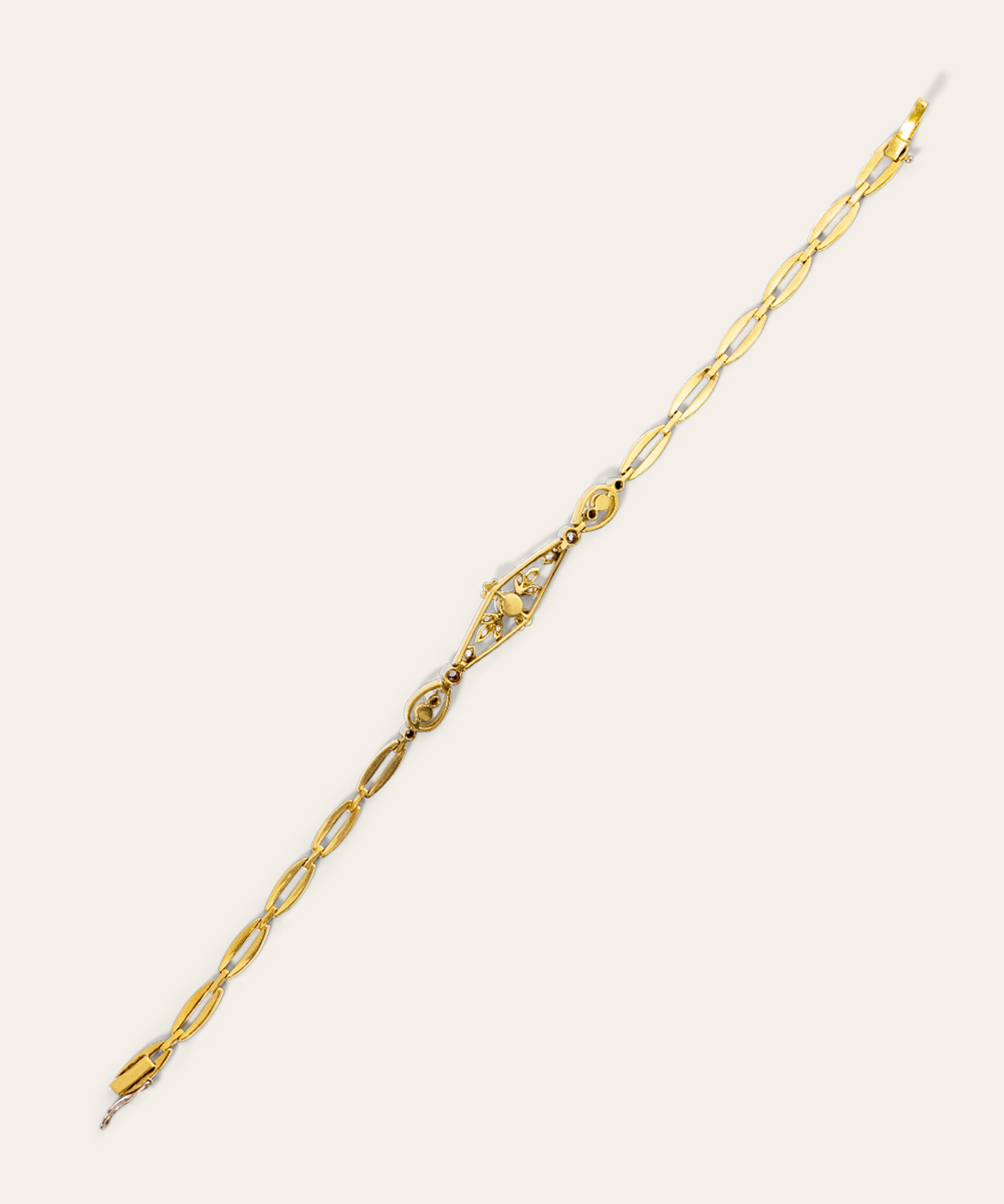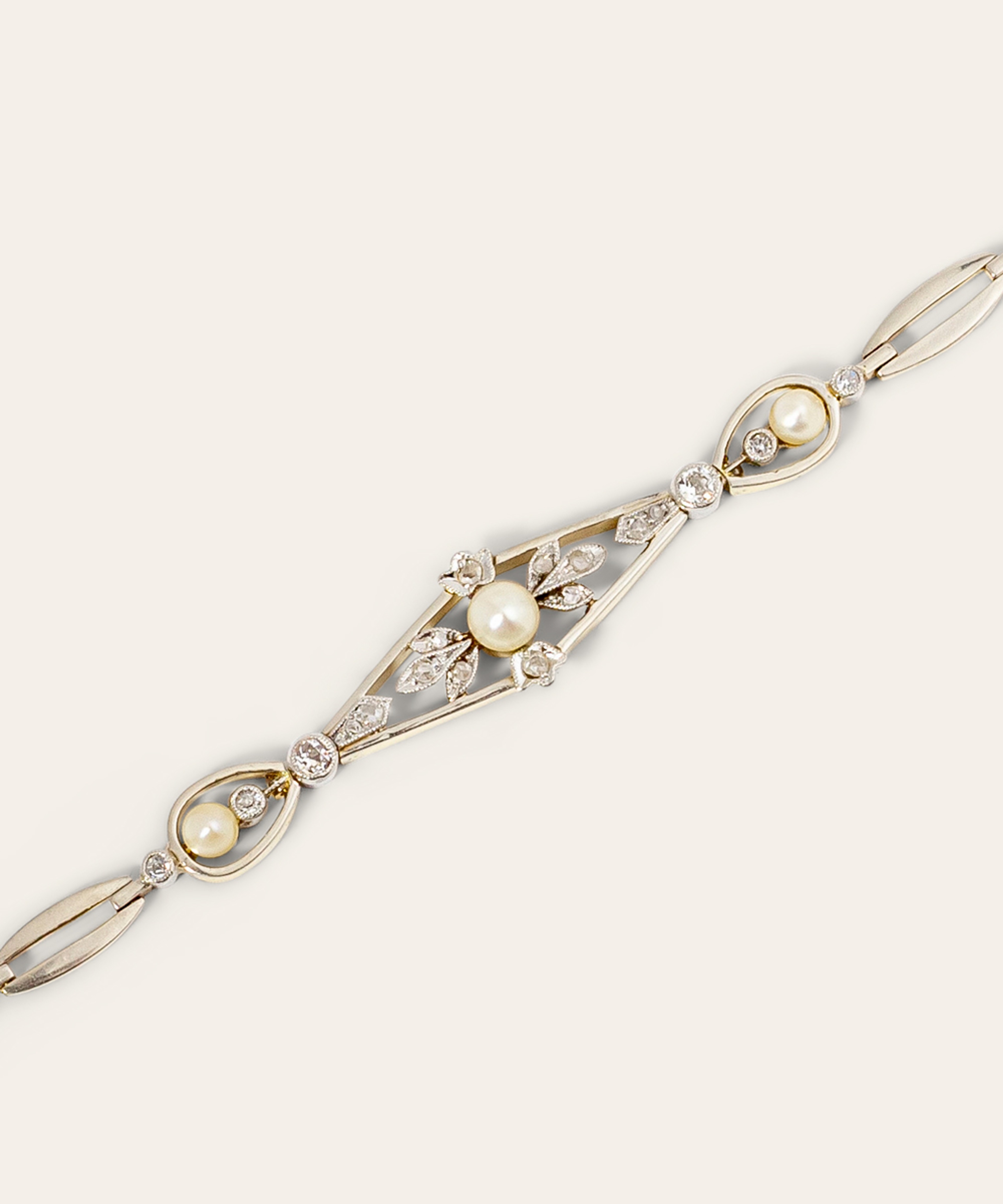 An antique Akoya pearl and diamond bracelet, crafted circa 1910 in platinum and 18ct yellow gold.