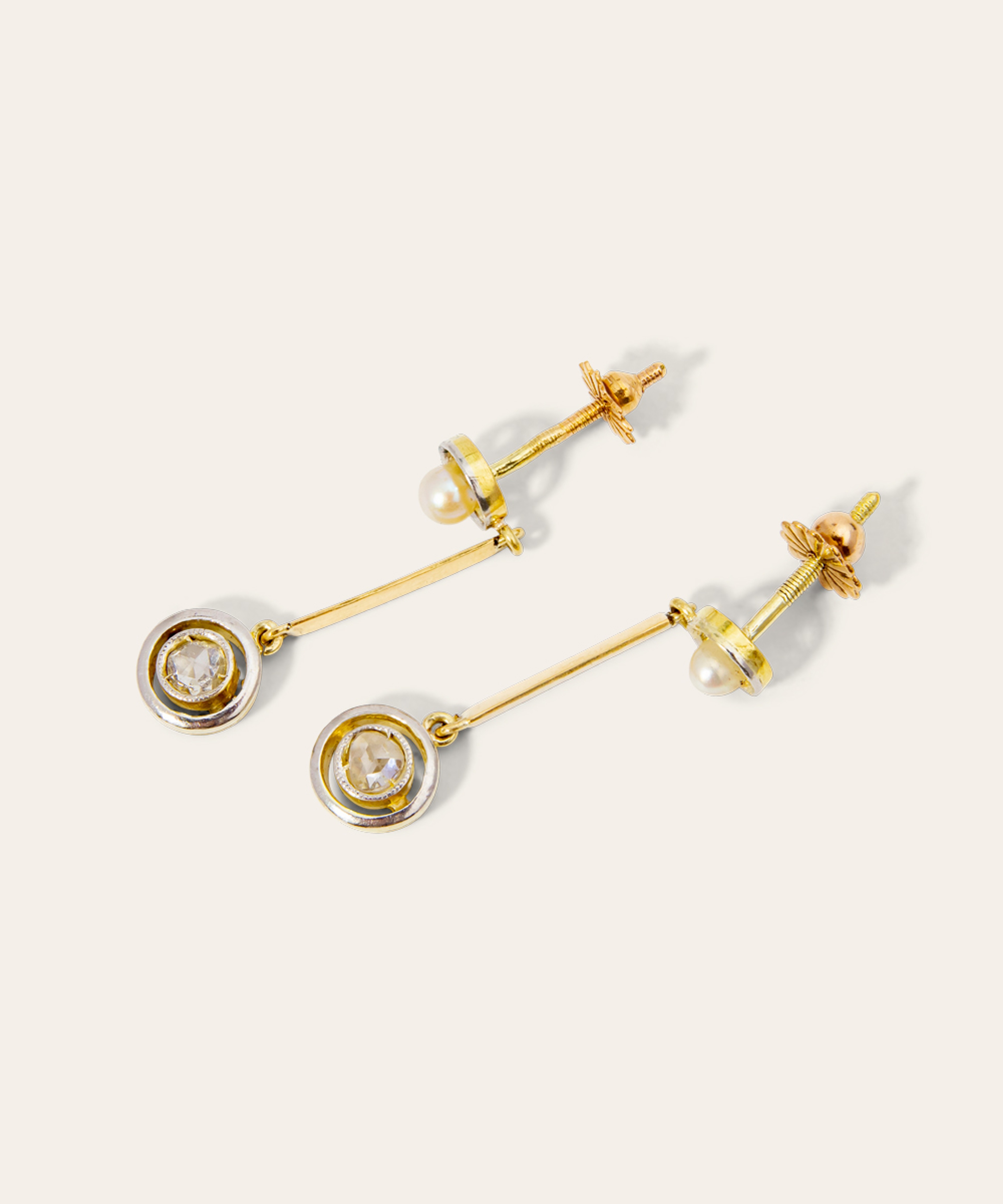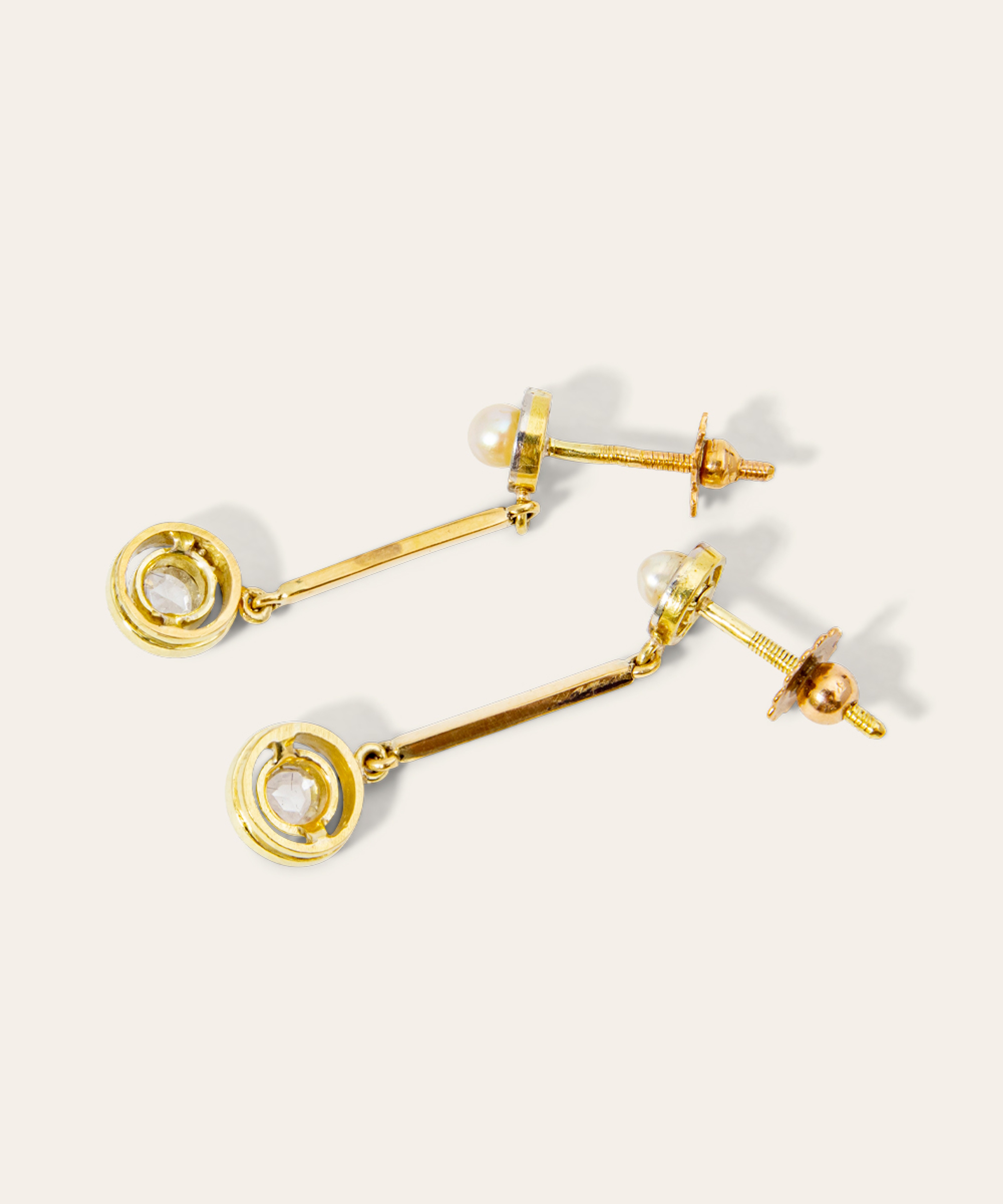 A pair of antique drop earrings, handcrafted in platinum and 18ct yellow gold, set with natural pearls and rose-cut diamonds, circa 1900.