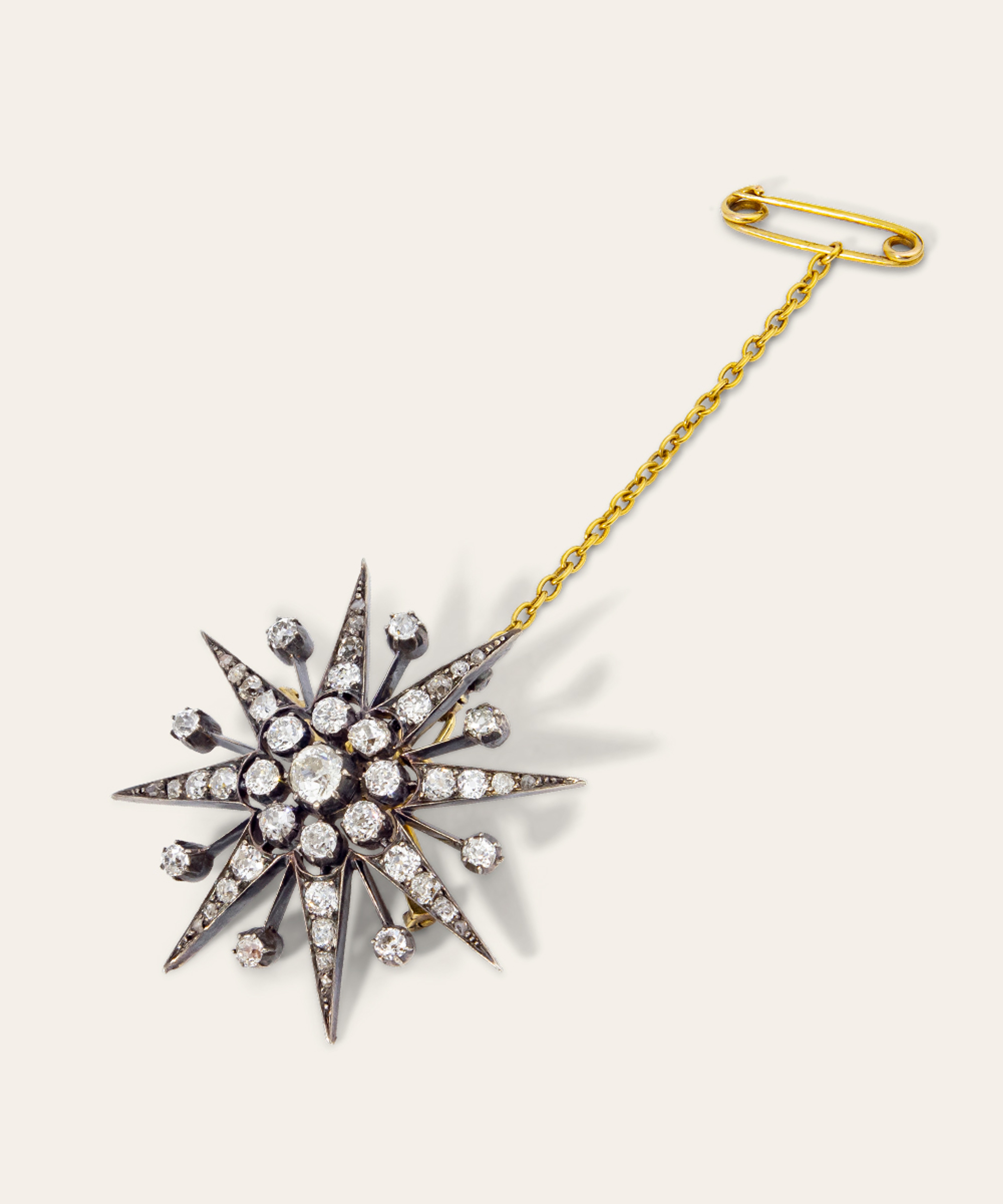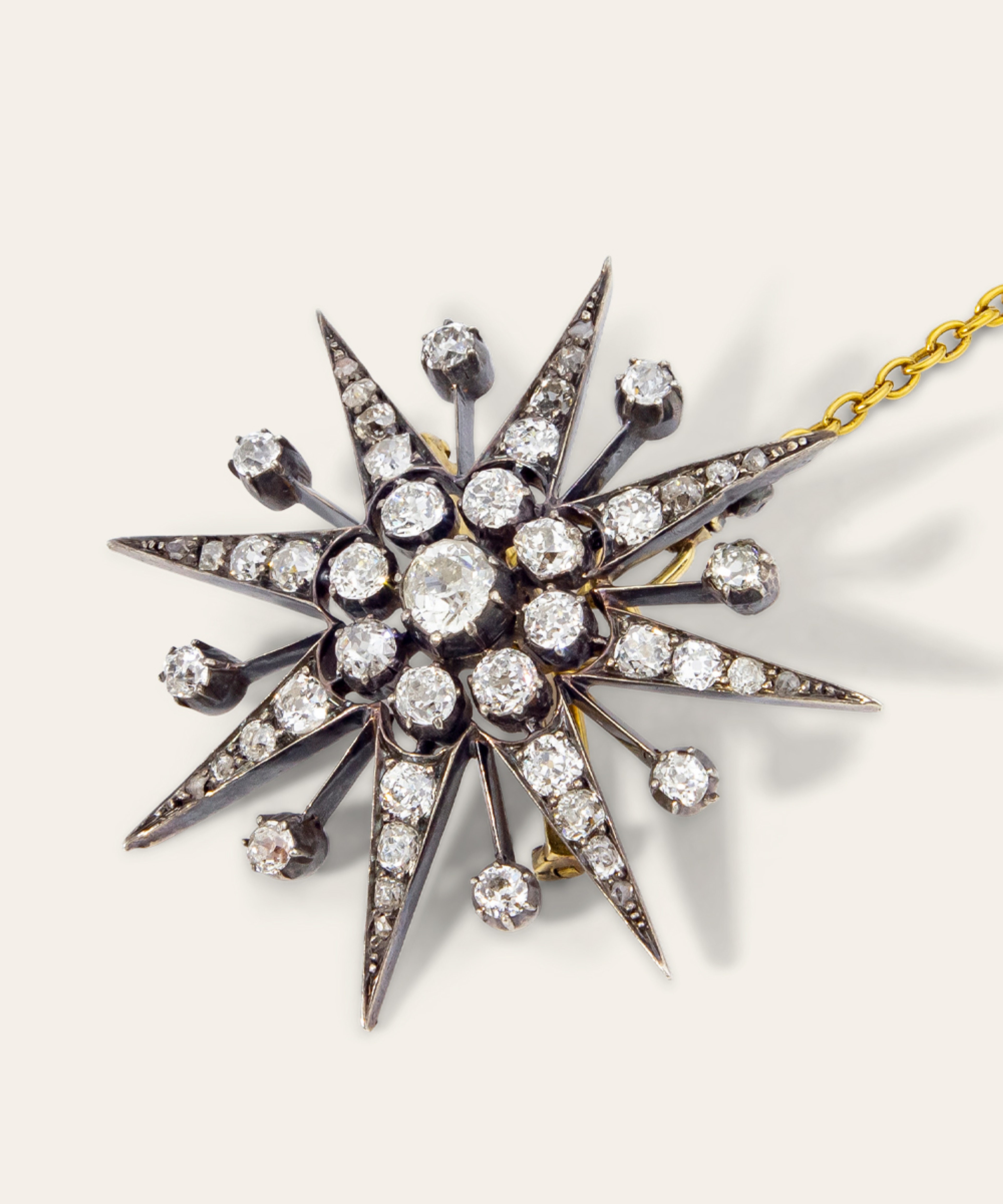 An antique diamond brooch/pendant, crafted circa 1830 in sterling silver topped gold with an 18ct yellow gold safety chain and pin. Set with Old European, Old Mine, and rose-cut diamonds totaling 2.90 carats.