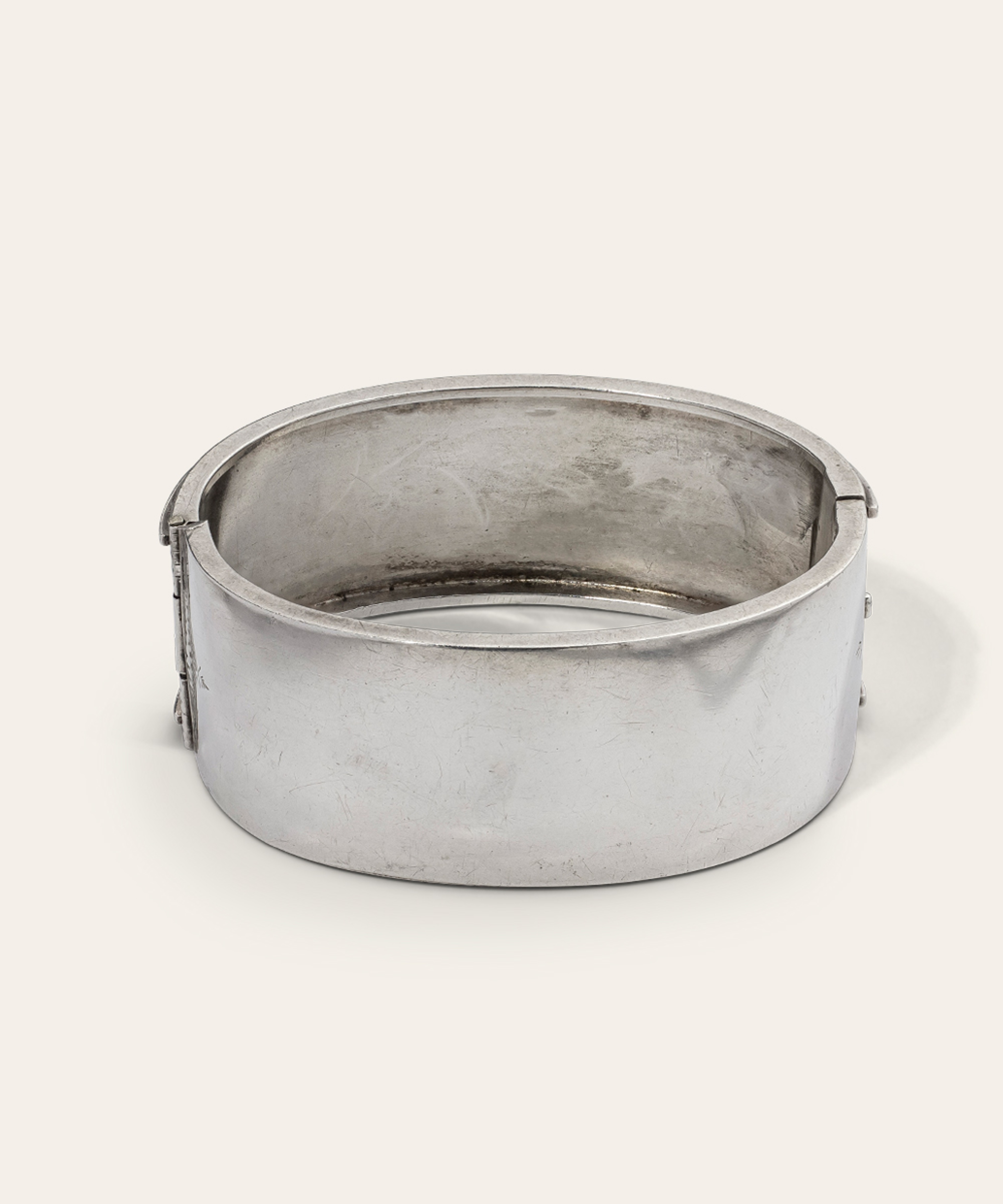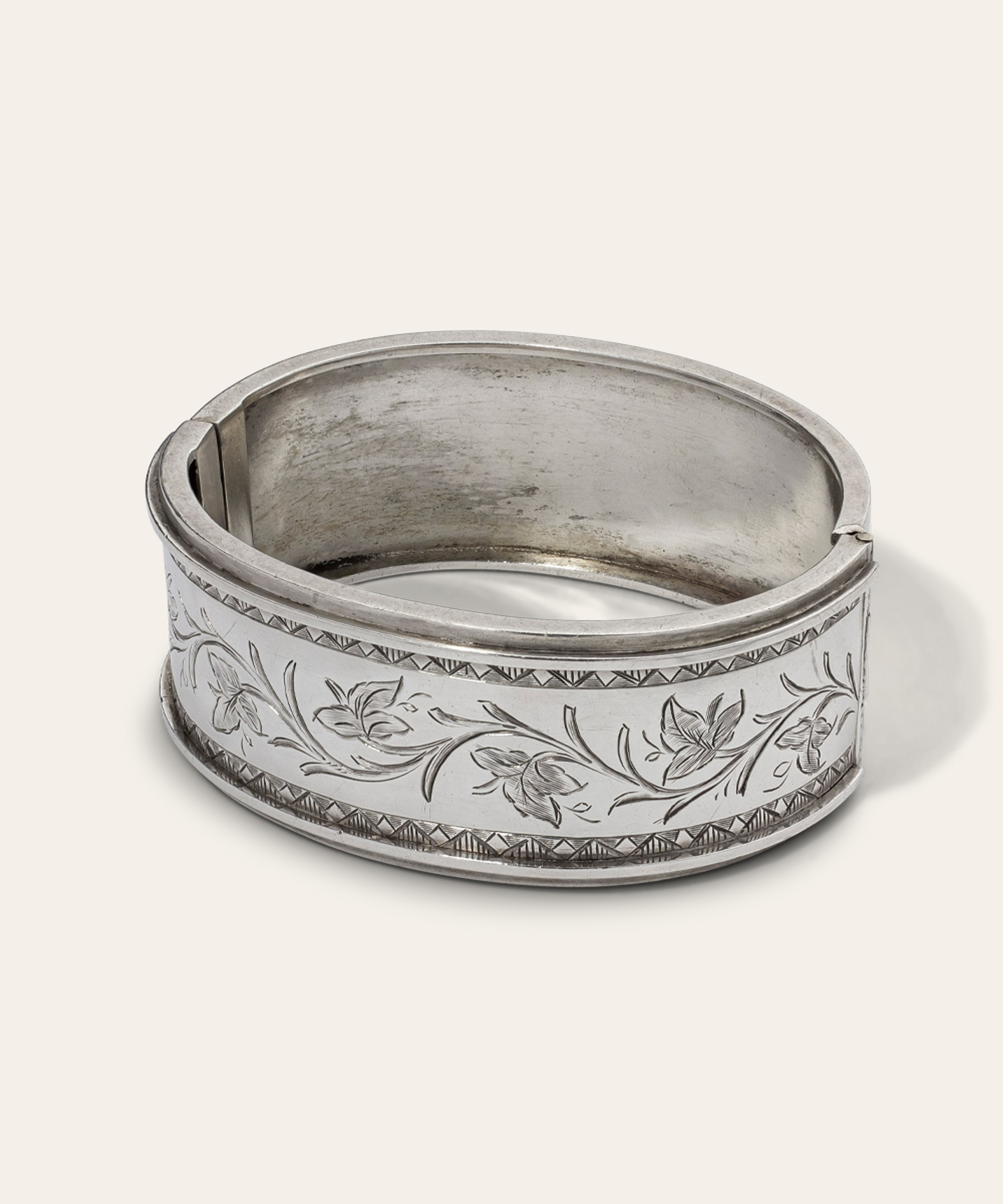 An antique hand-engraved cuff bracelet crafted from sterling silver, circa 1900.
