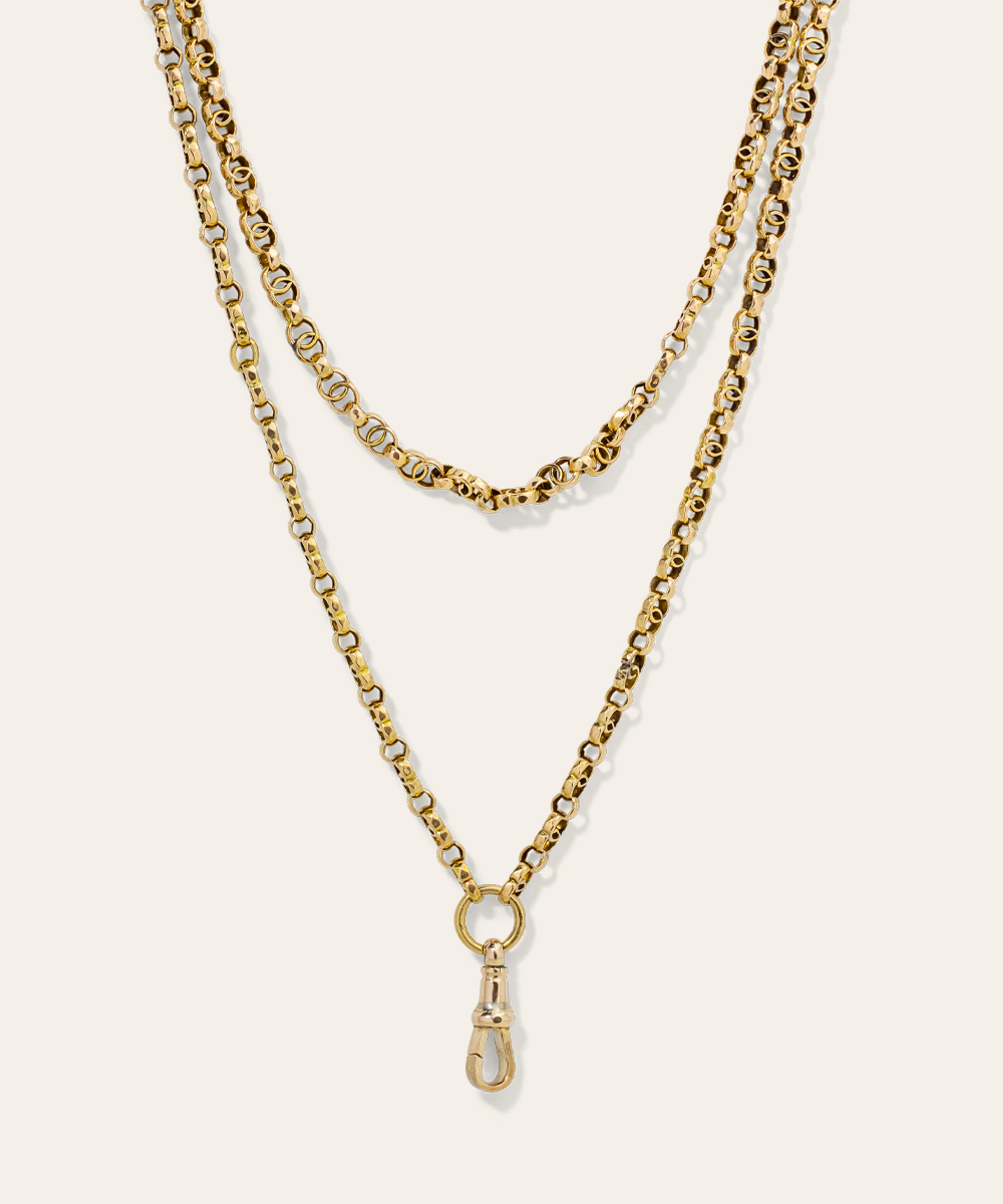An antique mariner-link guard chain crafted from 9ct yellow gold and finished with a dog clip.