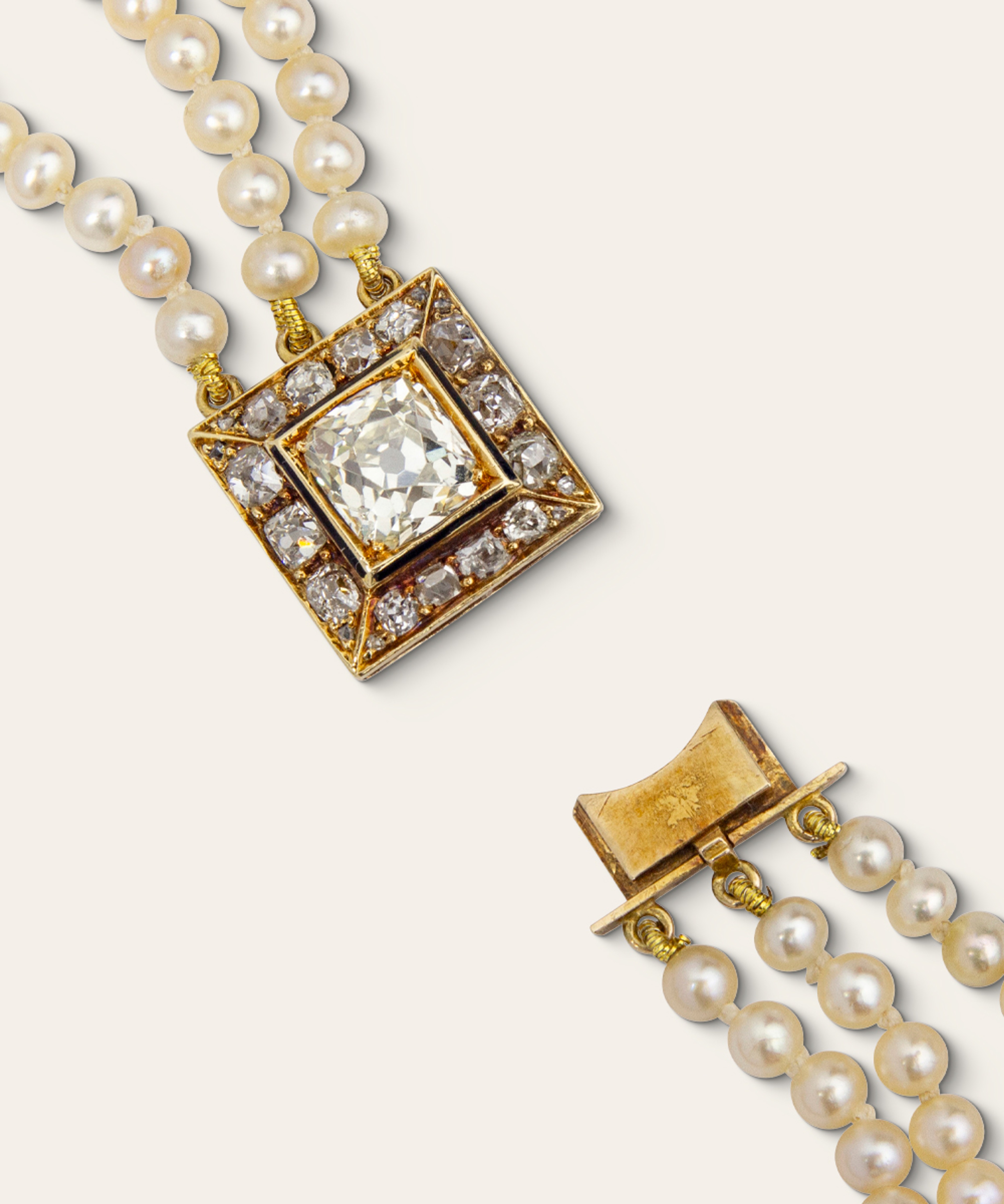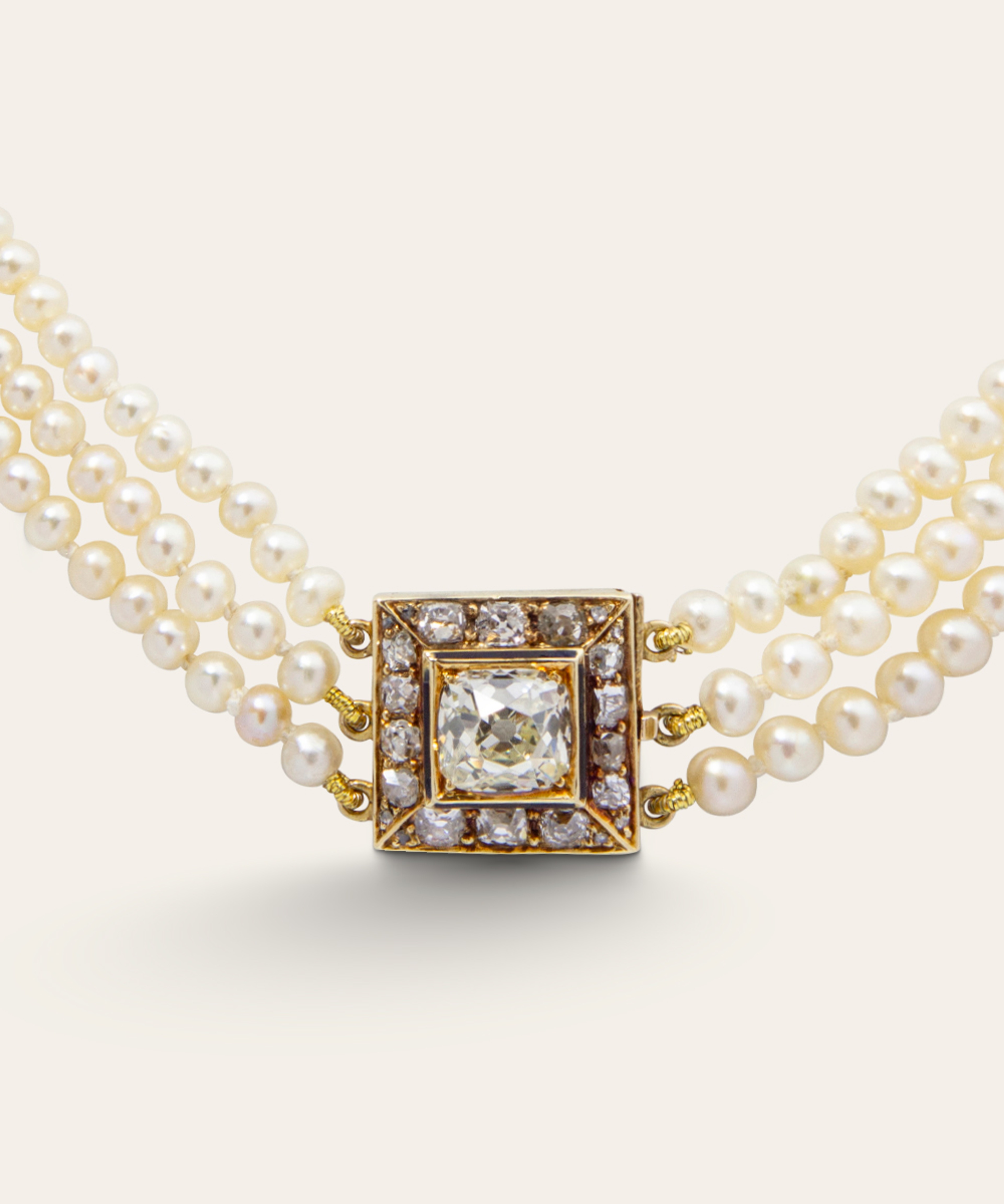 A choker length, triple-strand akoya pearl necklace with a diamond set, 18ct yellow gold square set clasp. With a total diamond weight of 1.62ct, the clasp centers on a 1.04ct old european cut diamond of K colour and VS2 clarity. Length is 14.5 inches (37cm)