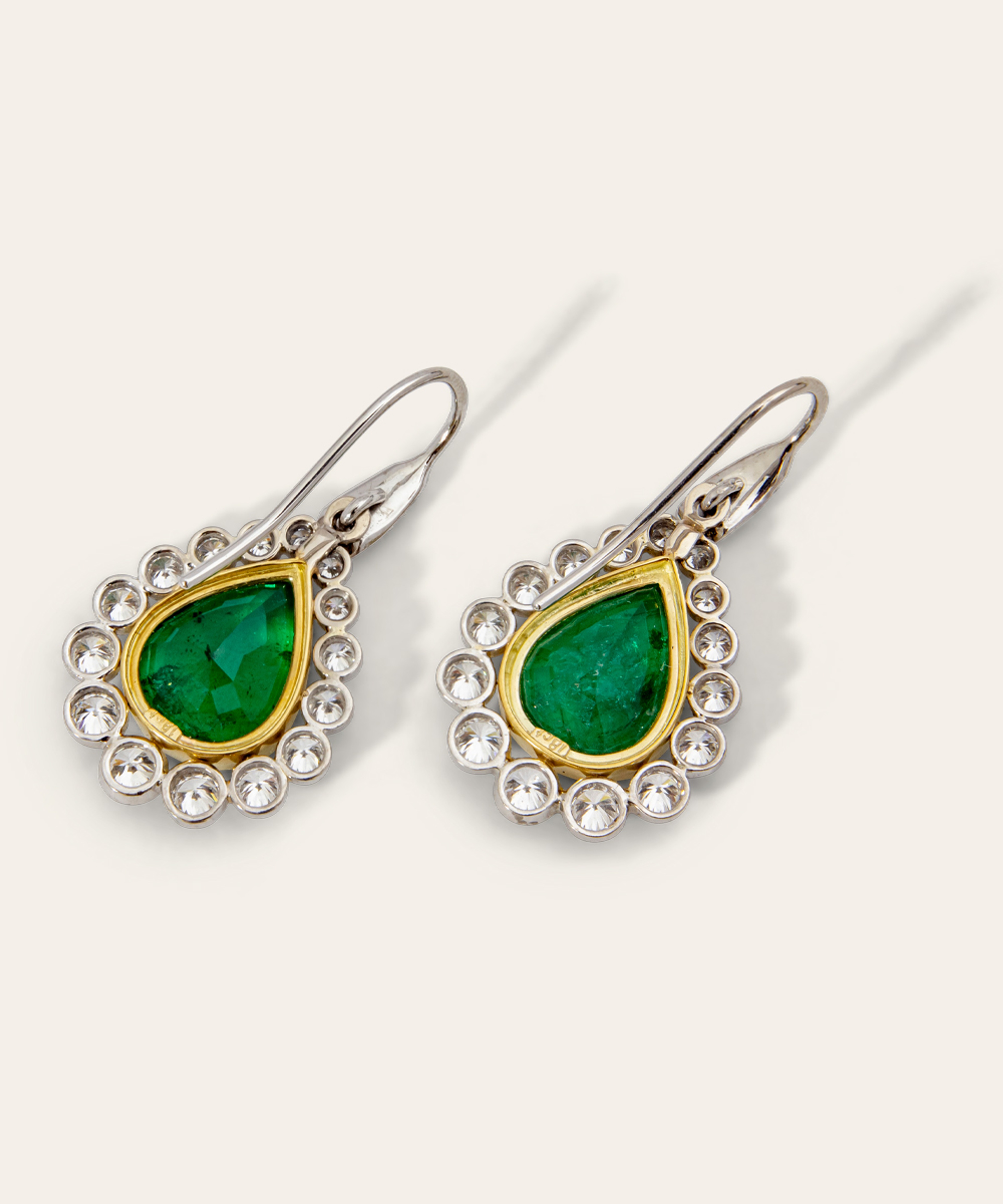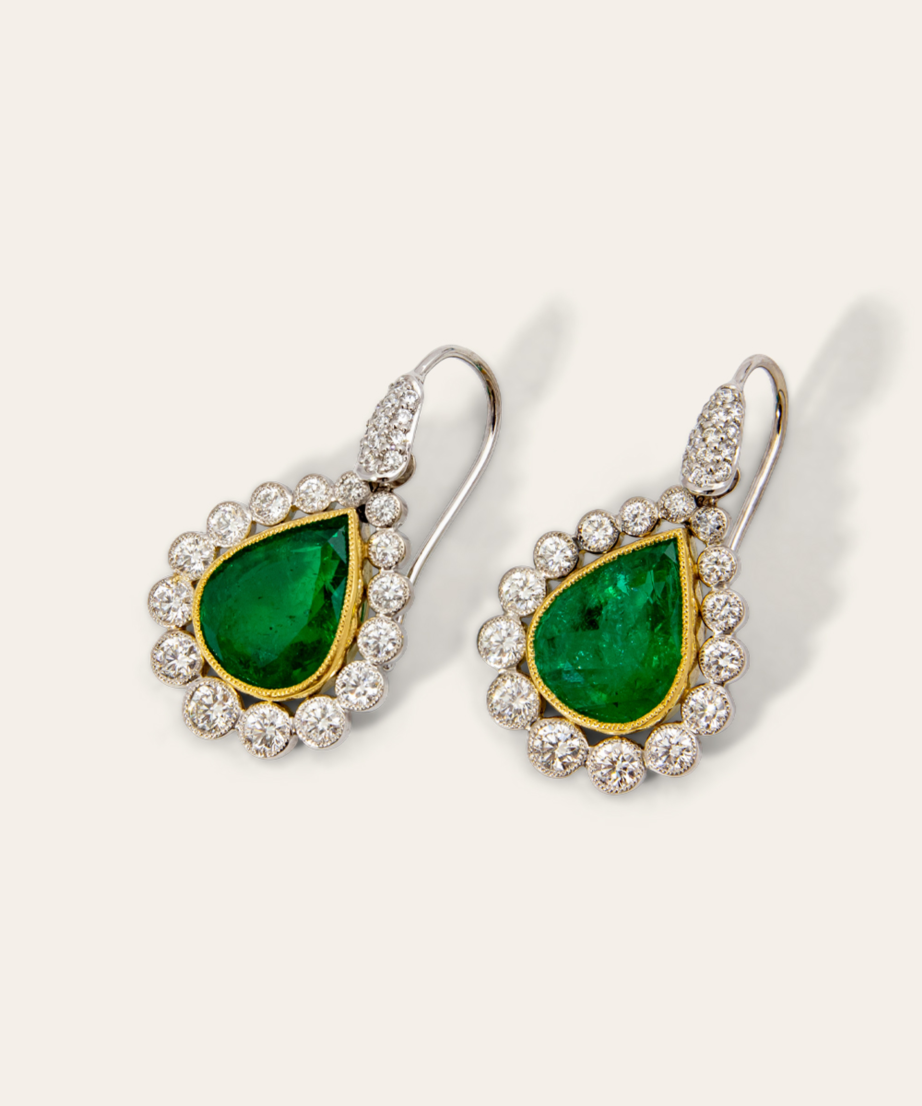 A pair of pendant drop emerald and diamond earrings, handcrafted by Isabella’s in 18ct yellow and white gold. Each earring is set with a pear-cut emerald of vivid green colour, weighing 4.24 and 4.23 carats respectively (total emerald weight 8.47 carats), and accented with thirty round brilliant-cut diamonds of F–G colour and VS–SI clarity, totaling 2.07 carats.