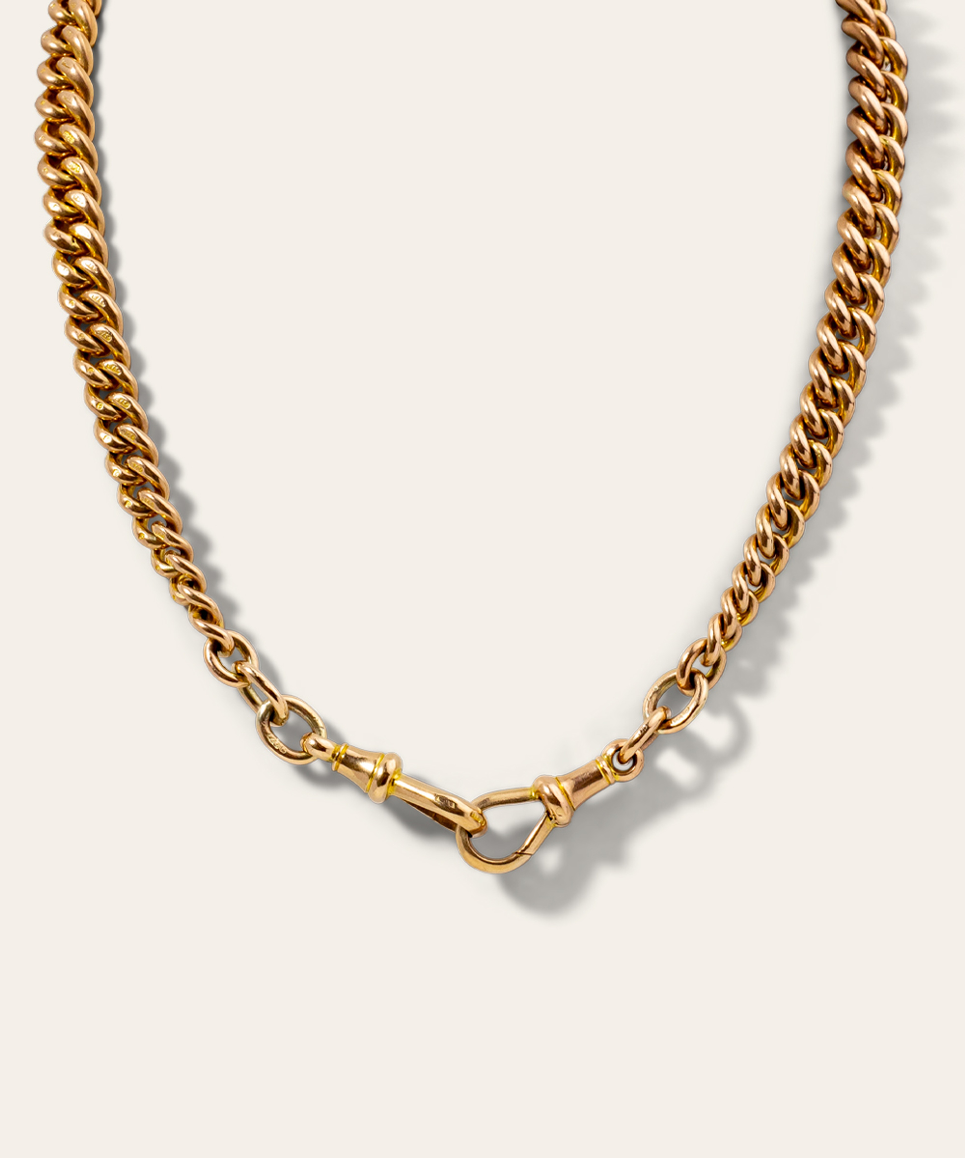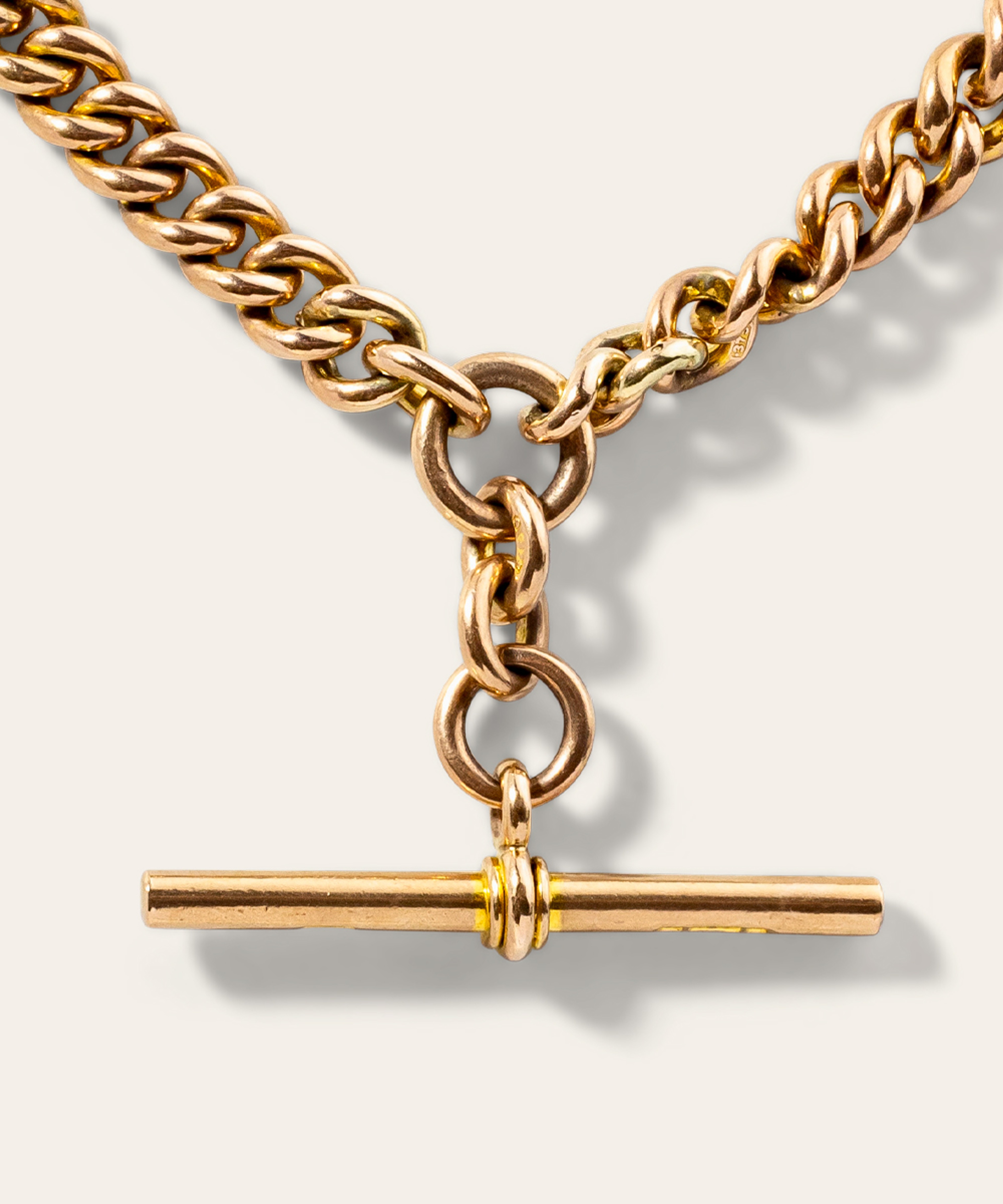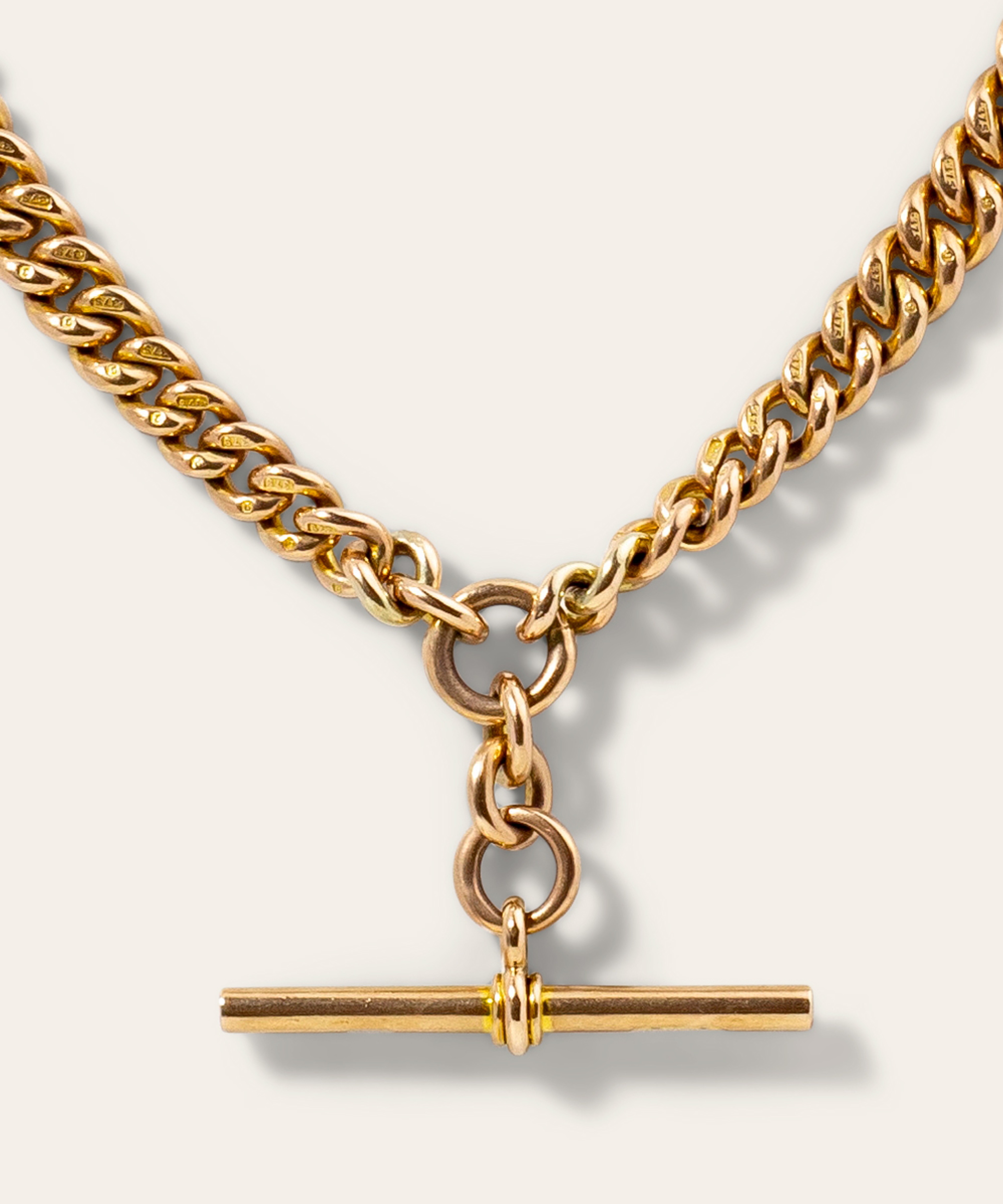A 9ct rose gold curb link Albert chain, hallmarked in Birmingham, featuring a T-bar and dog clips. Measuring 41 cm in finished length and weighing 62.77 grams.