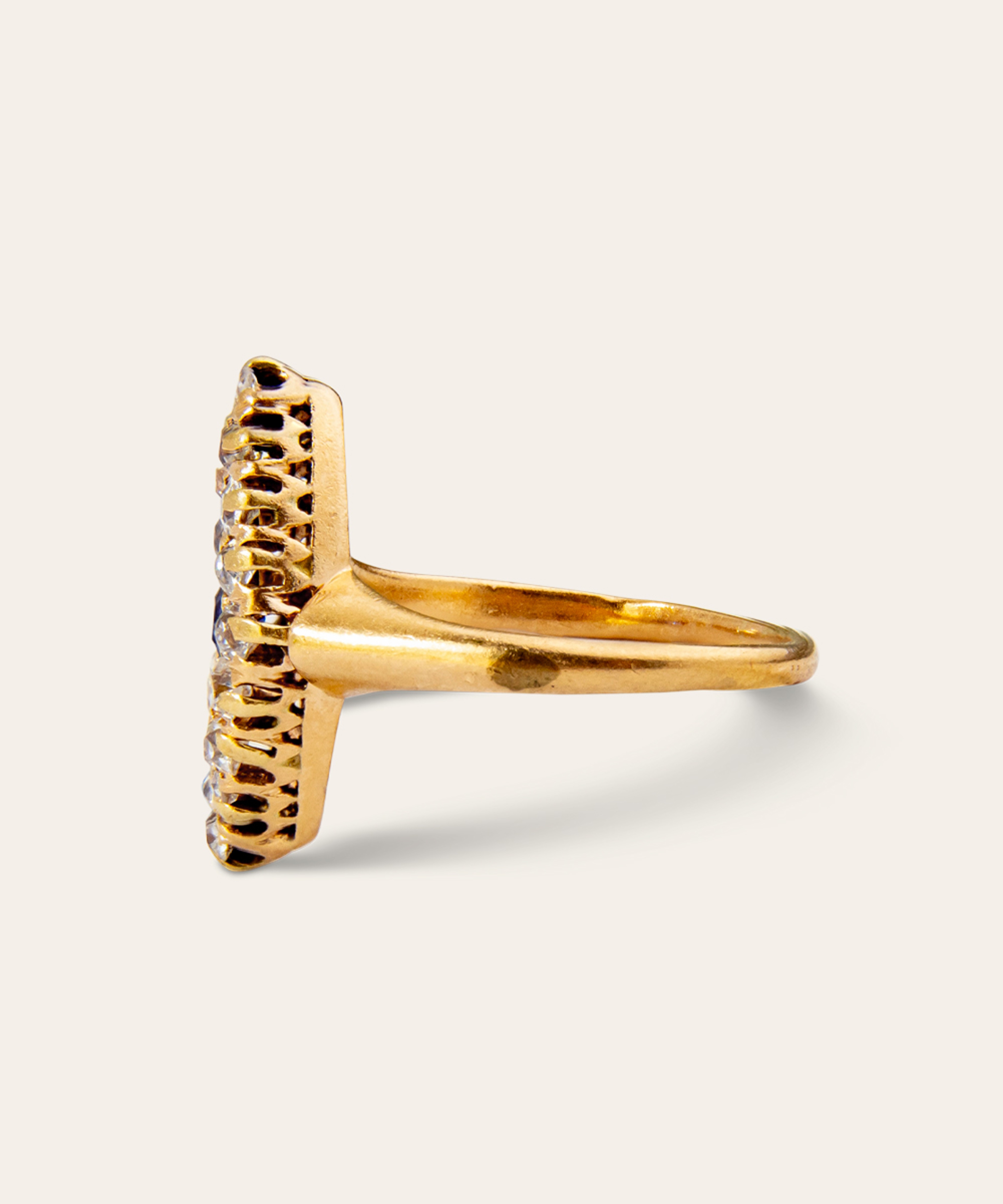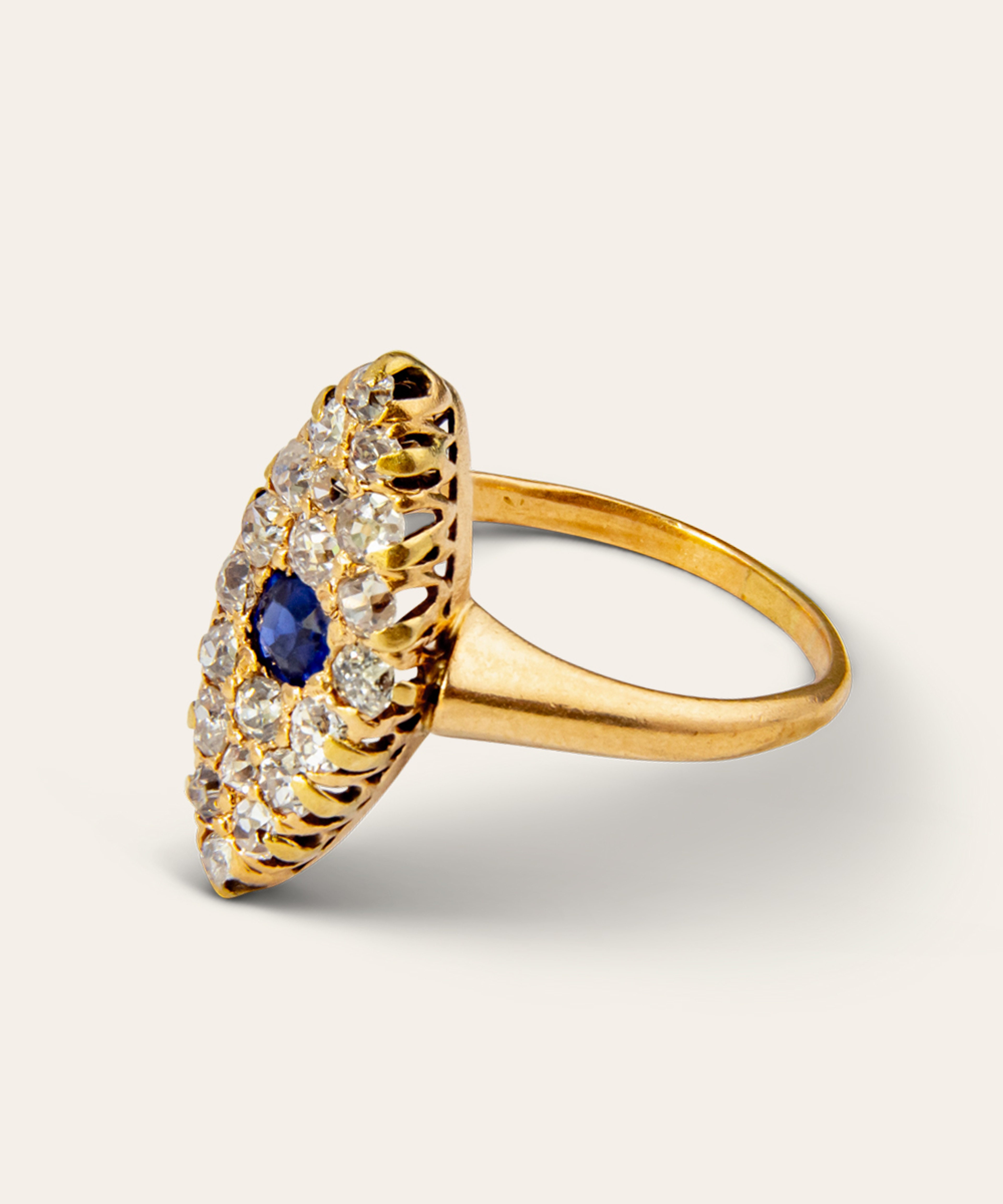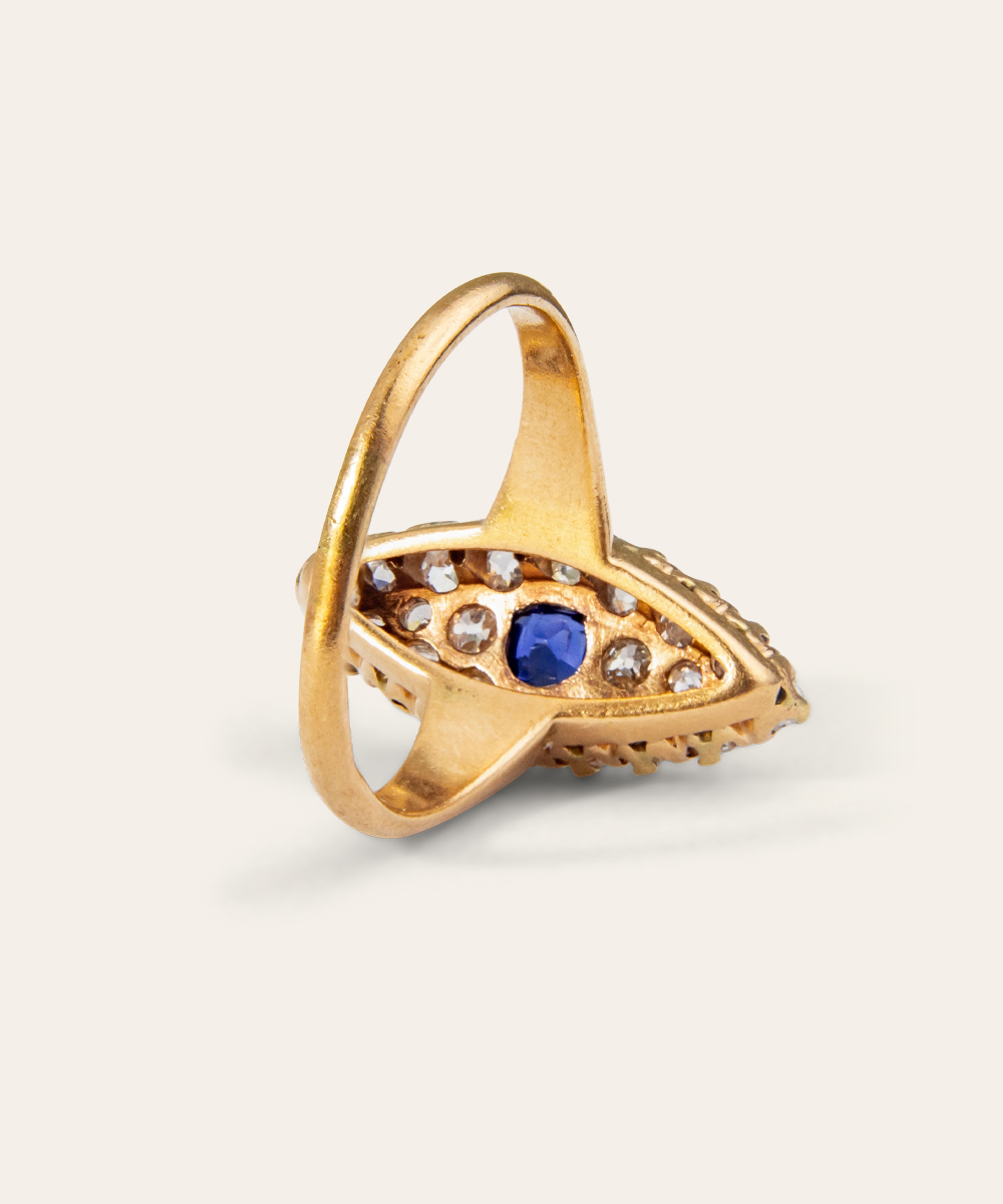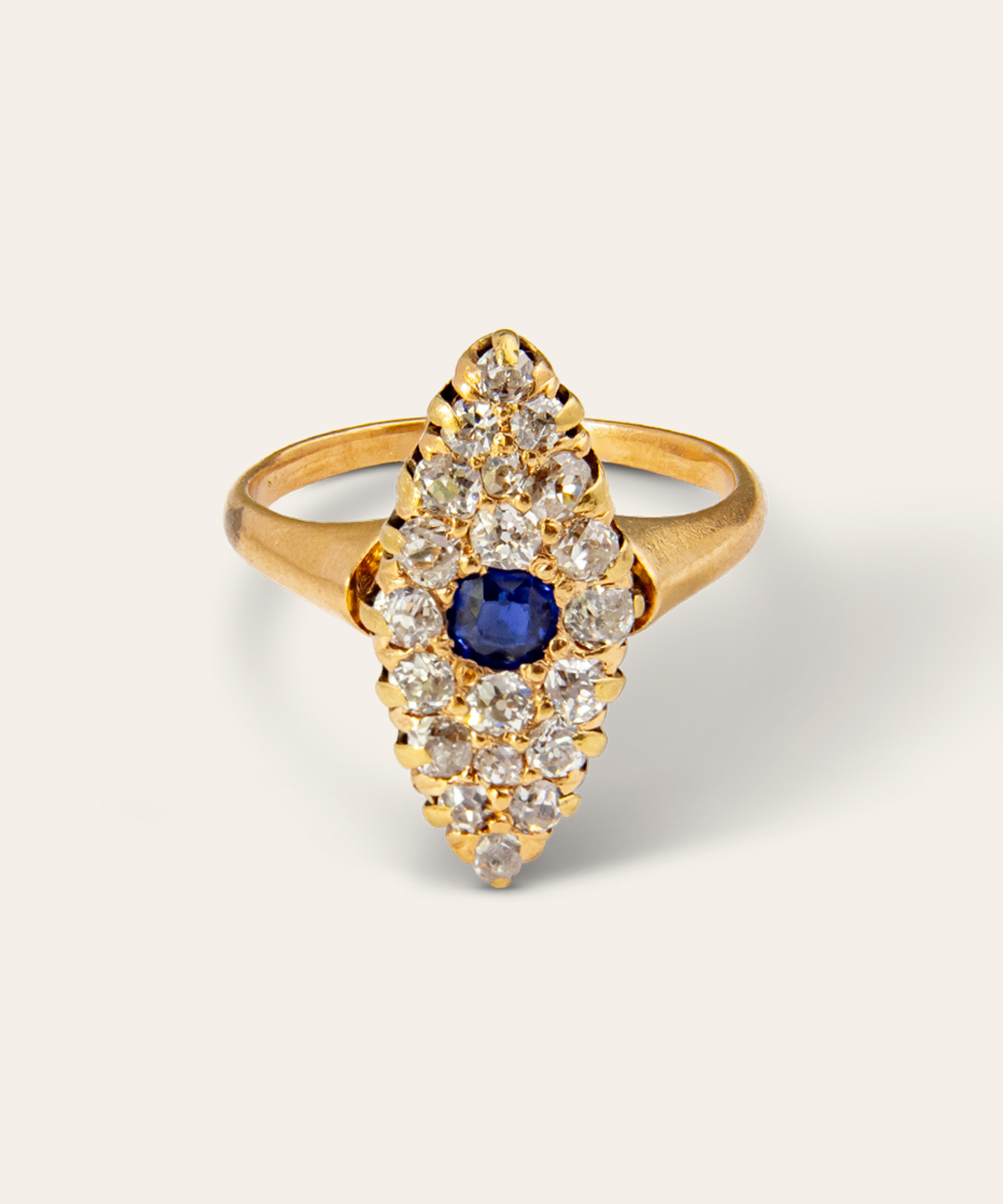 A Victorian sapphire and diamond navette ring, handcrafted in 18ct yellow gold, set with transitional-cut diamonds with a total estimated diamond weight of 0.58 carats.
