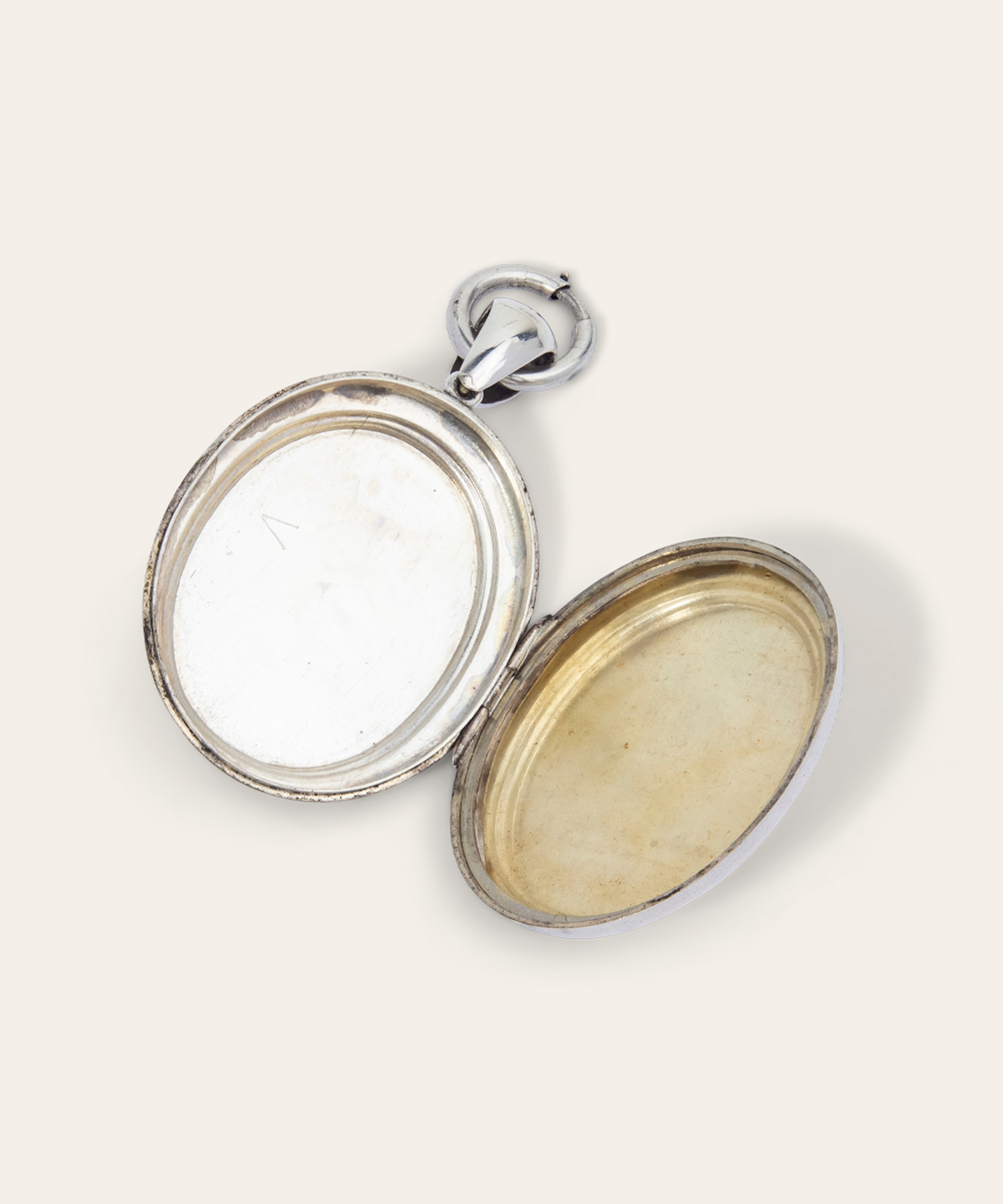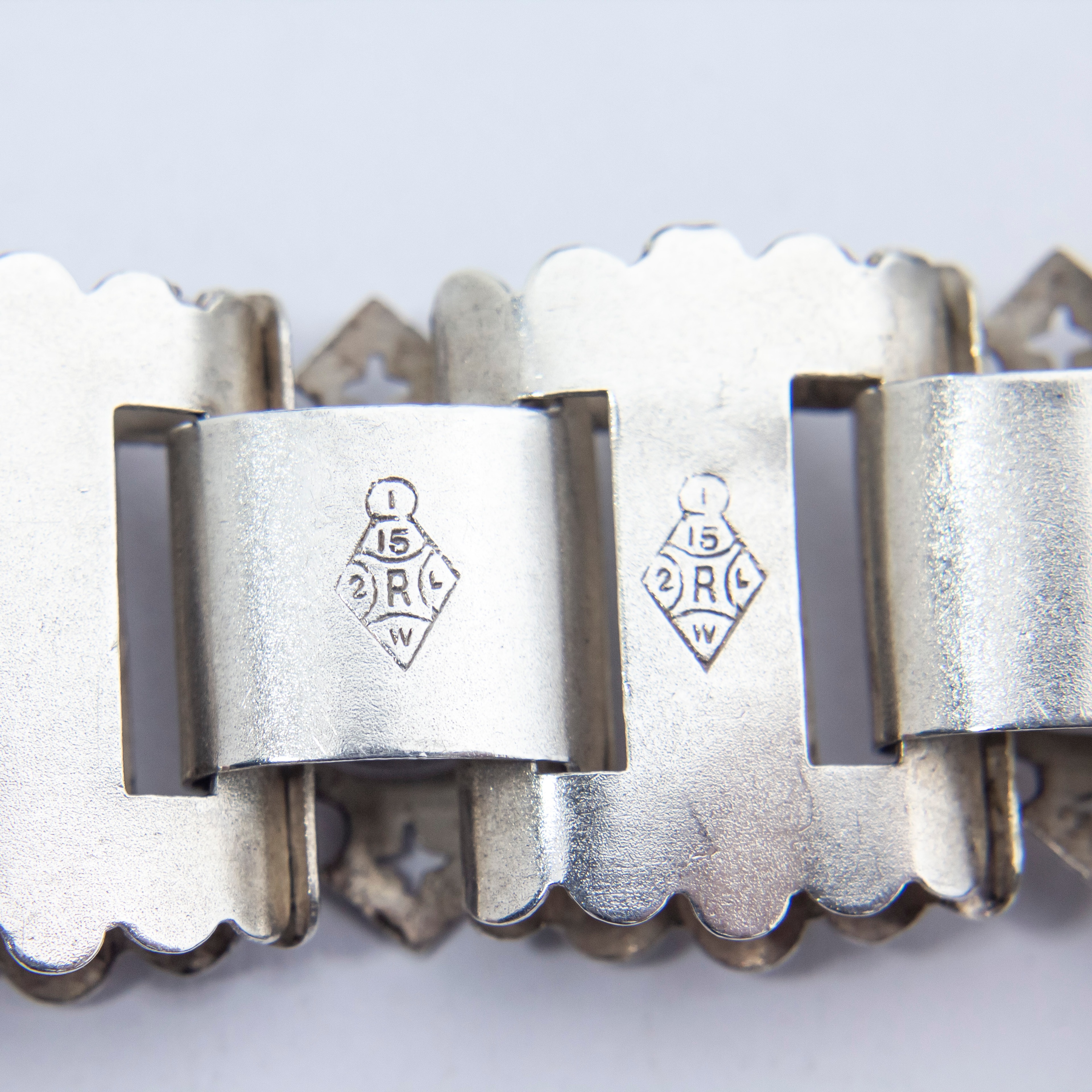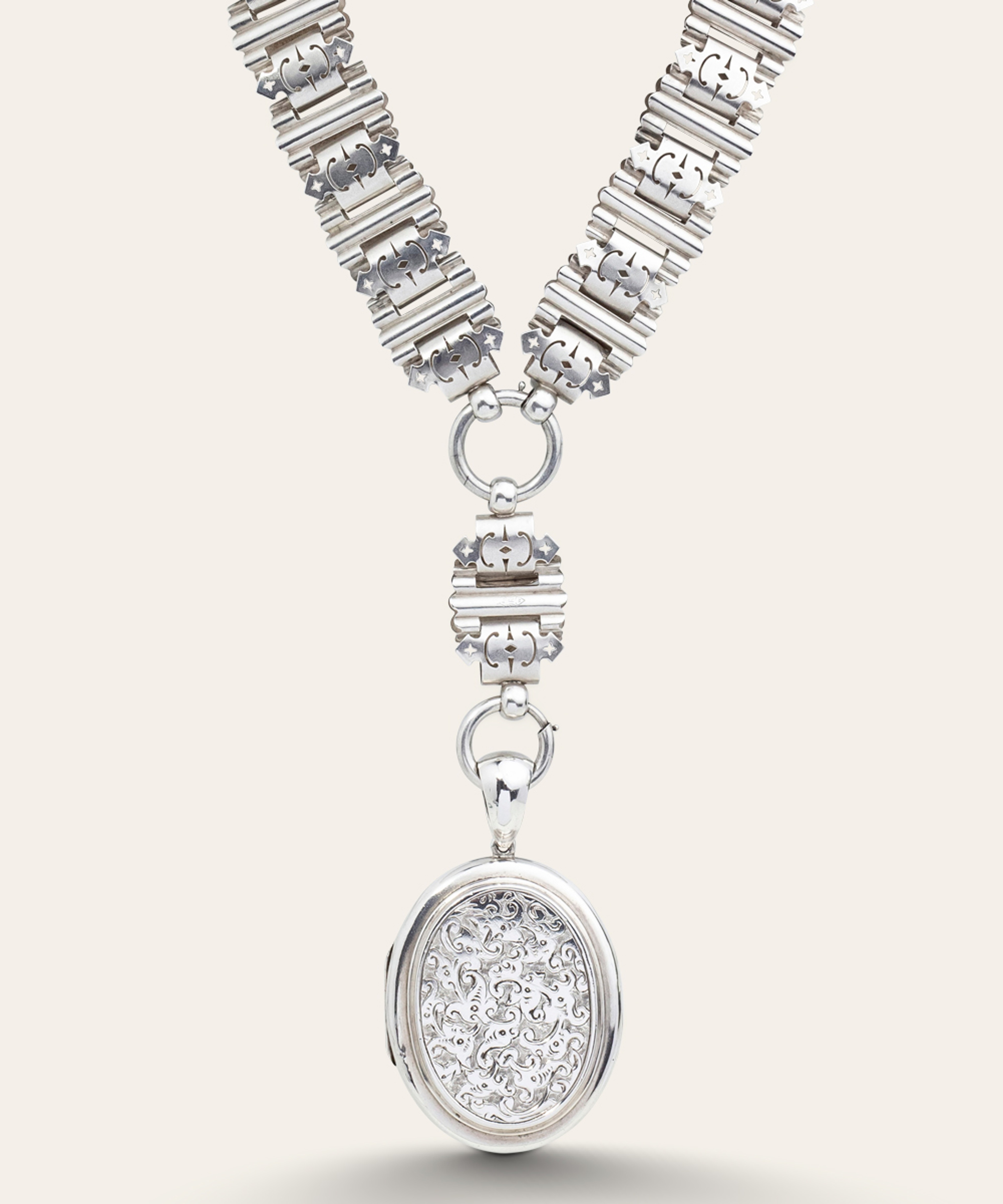 A Victorian sterling silver pierced book collar necklace with an extension piece and a British registry mark dated March 15, 1882. The accompanying hand-engraved sterling silver locket, crafted circa 1890, is a sympathetic match to the chain.
