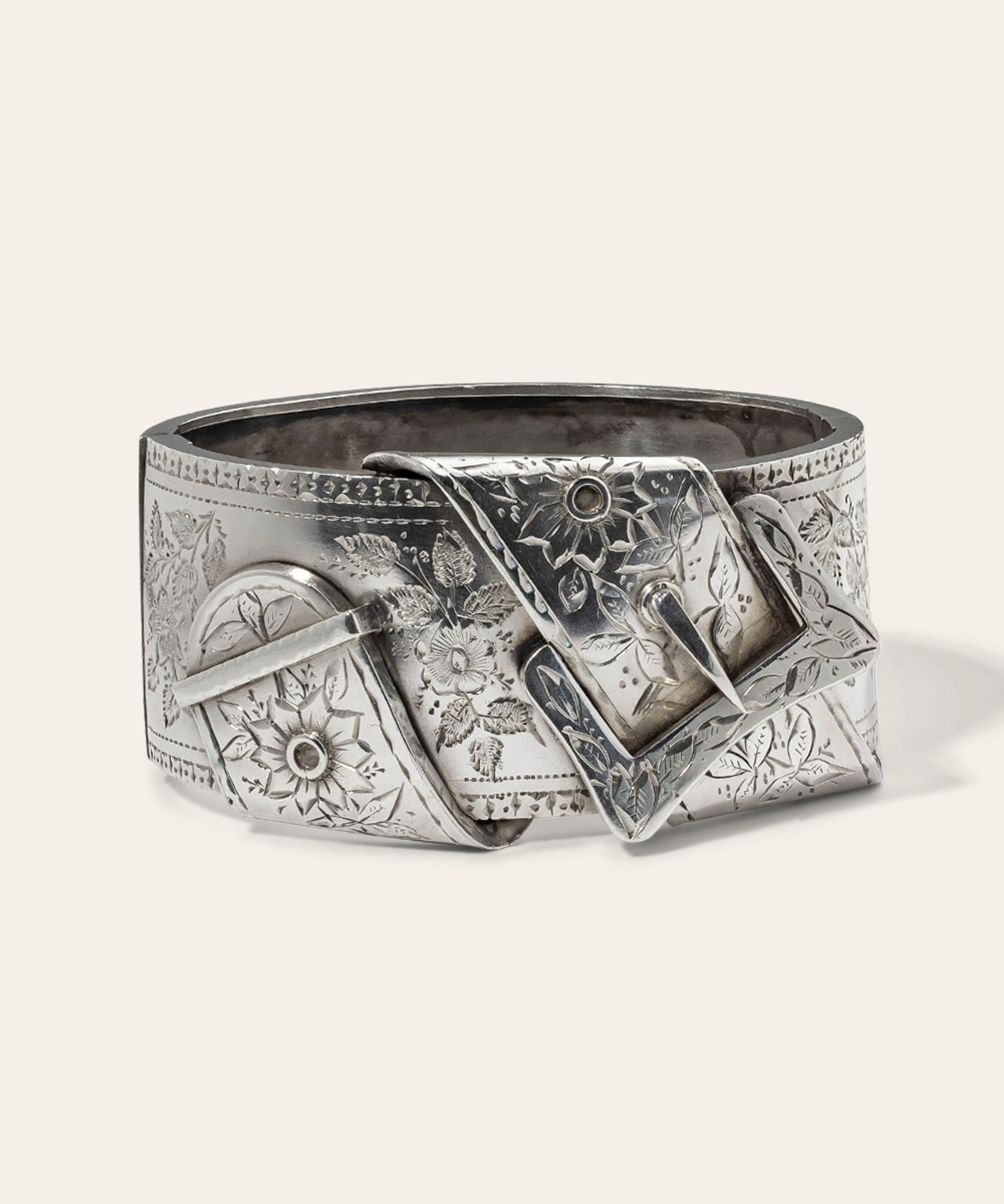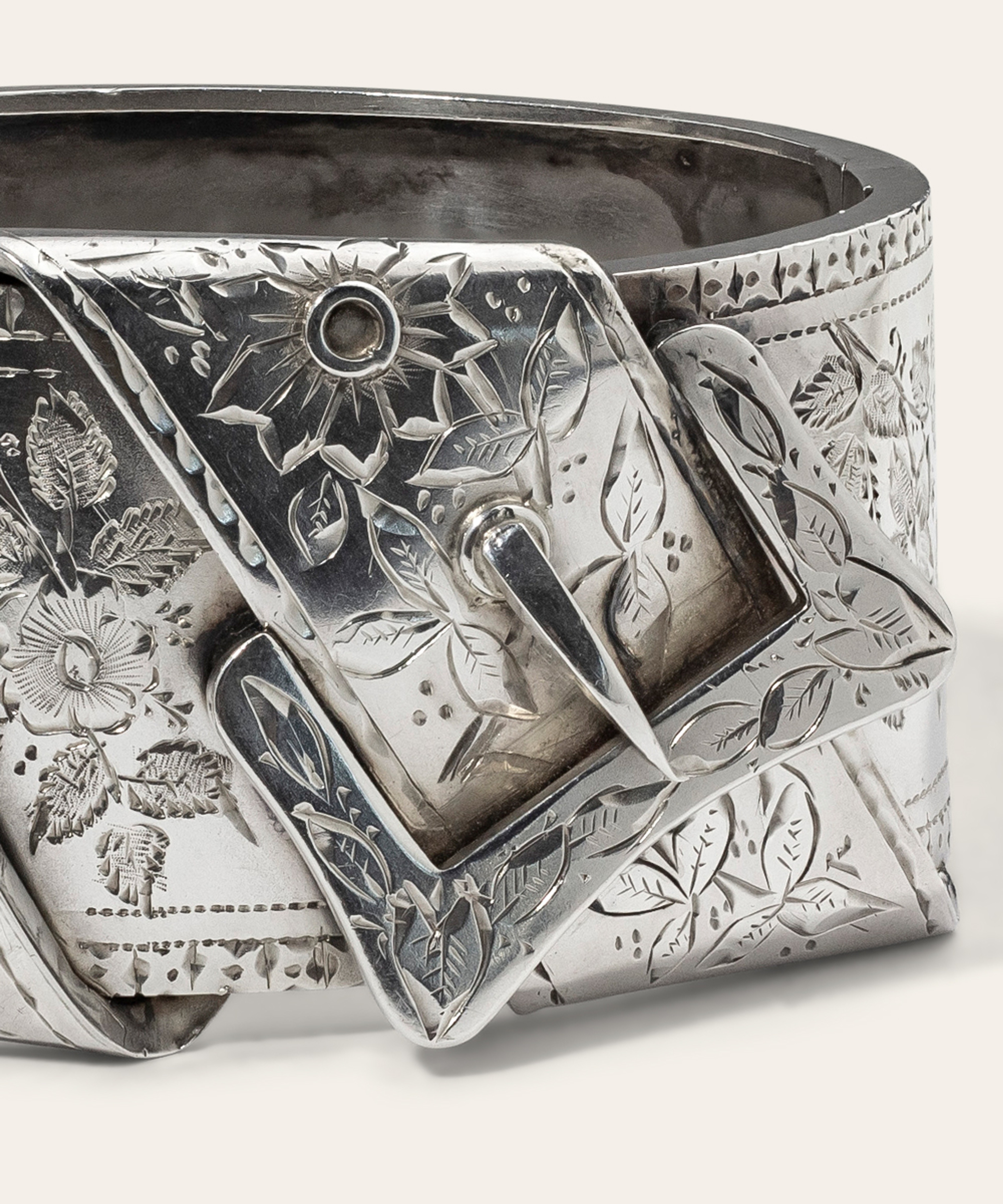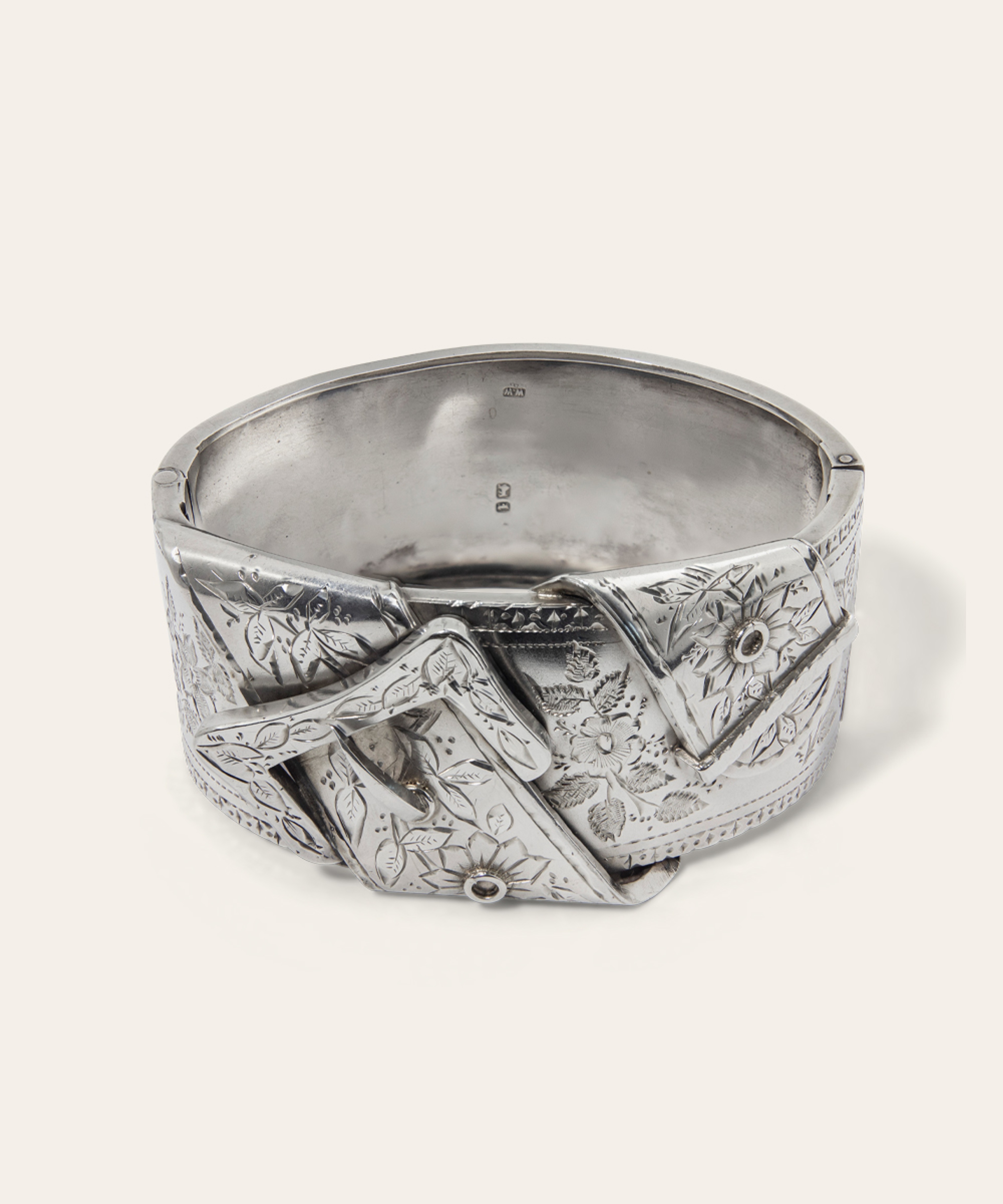 A Victorian oval sterling silver cuff, buckle-engraved and hallmarked for Birmingham, circa 1885.