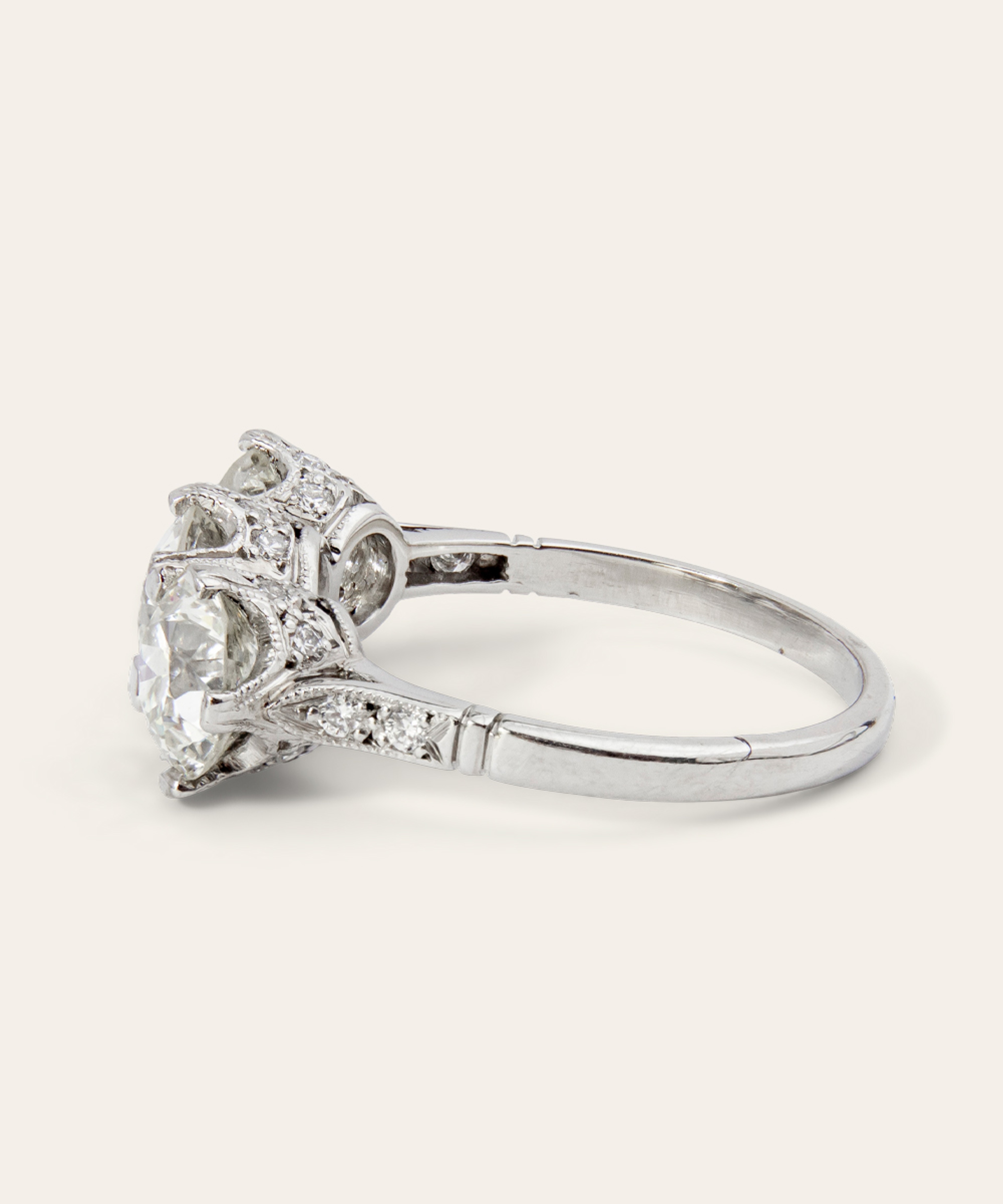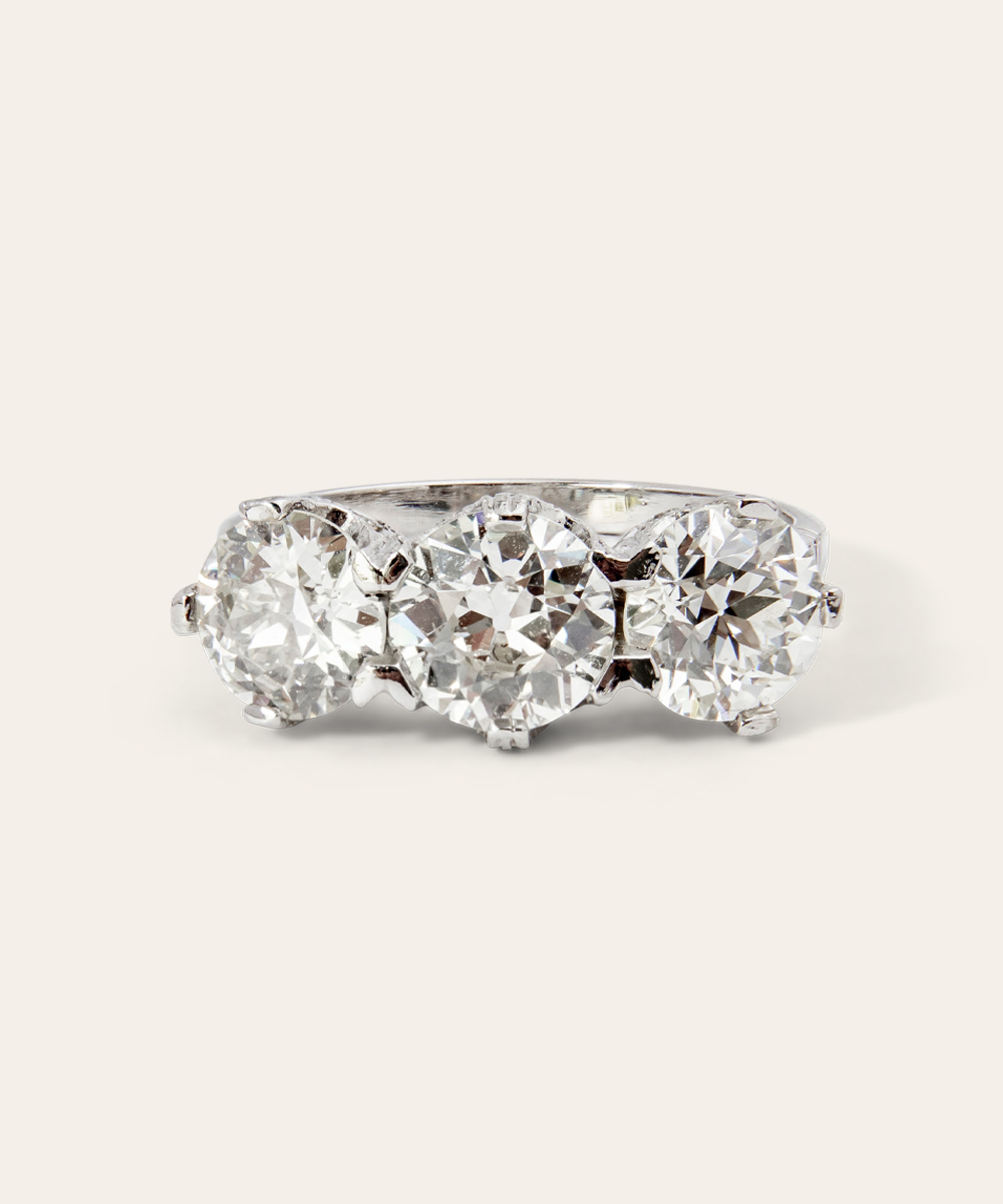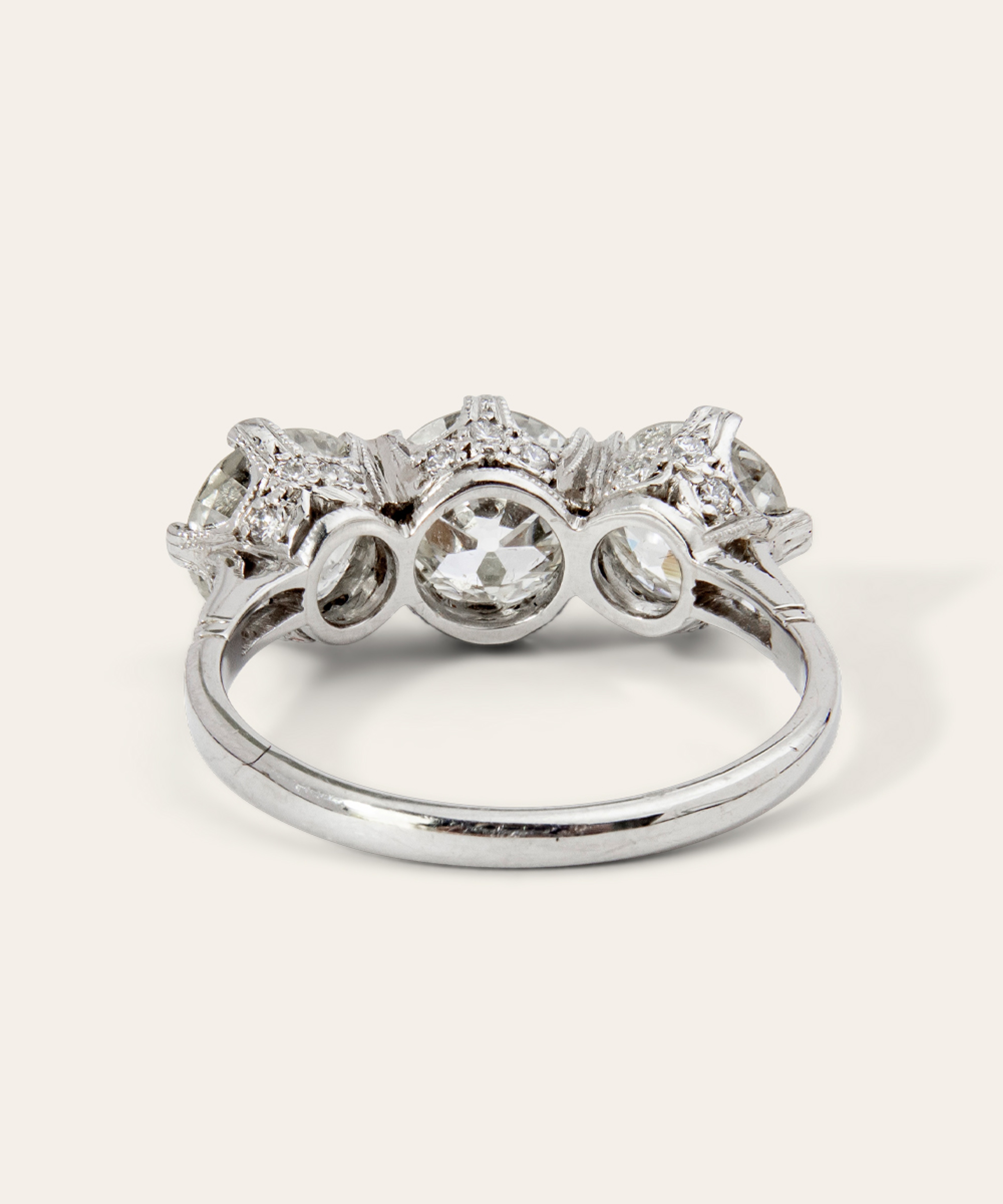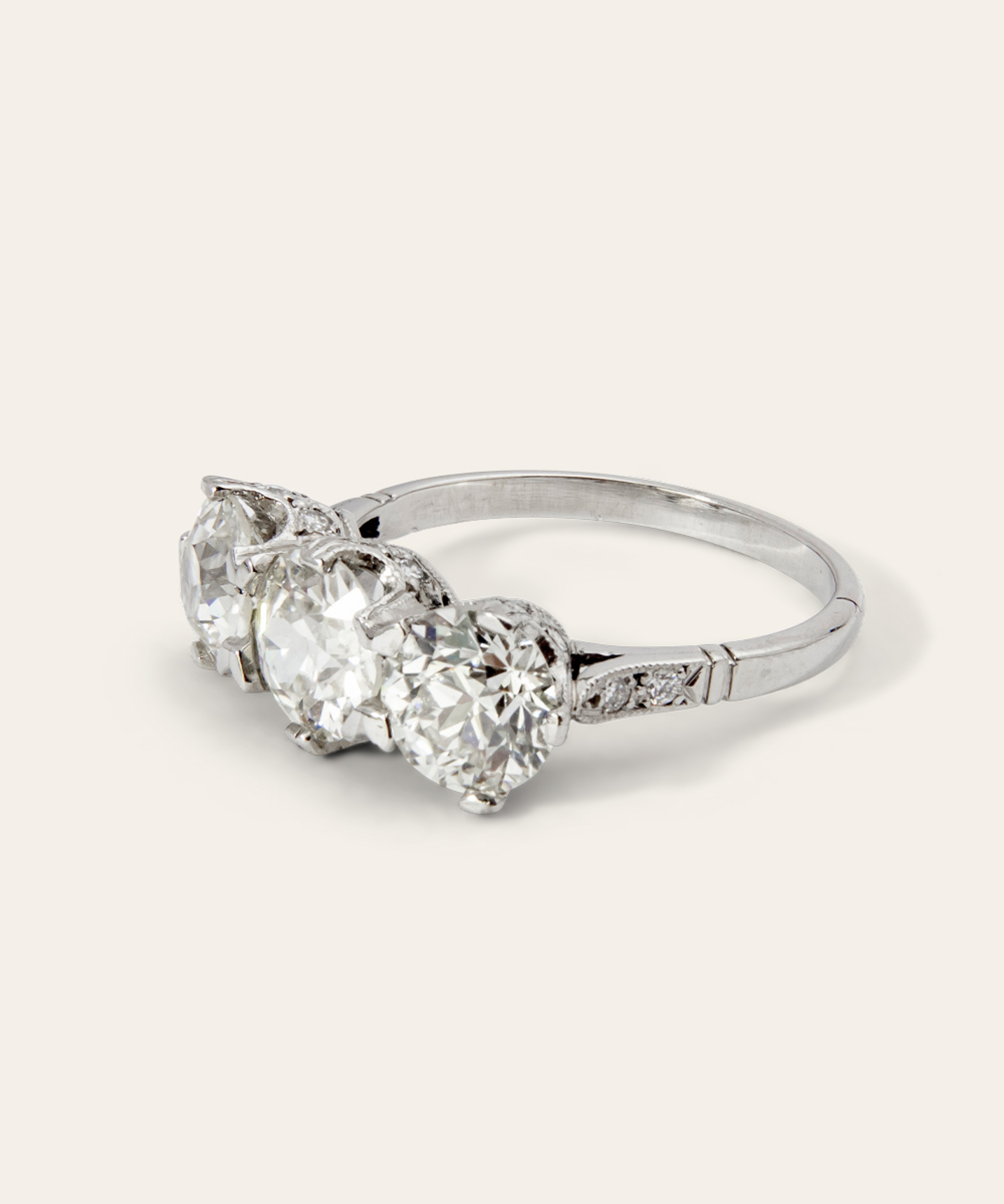 A vintage diamond trilogy ring, crafted in platinum circa 1930, set with three transitional brilliant-cut diamonds weighing 0.98, 1.20, and 1.19 carats respectively, of J–K colour and SI1–SI2 clarity. The shoulders are finely micro bead-set with eighteen transitional brilliant-cut diamonds totaling 0.09 carats, of K–L colour and SI1–SI2 clarity.