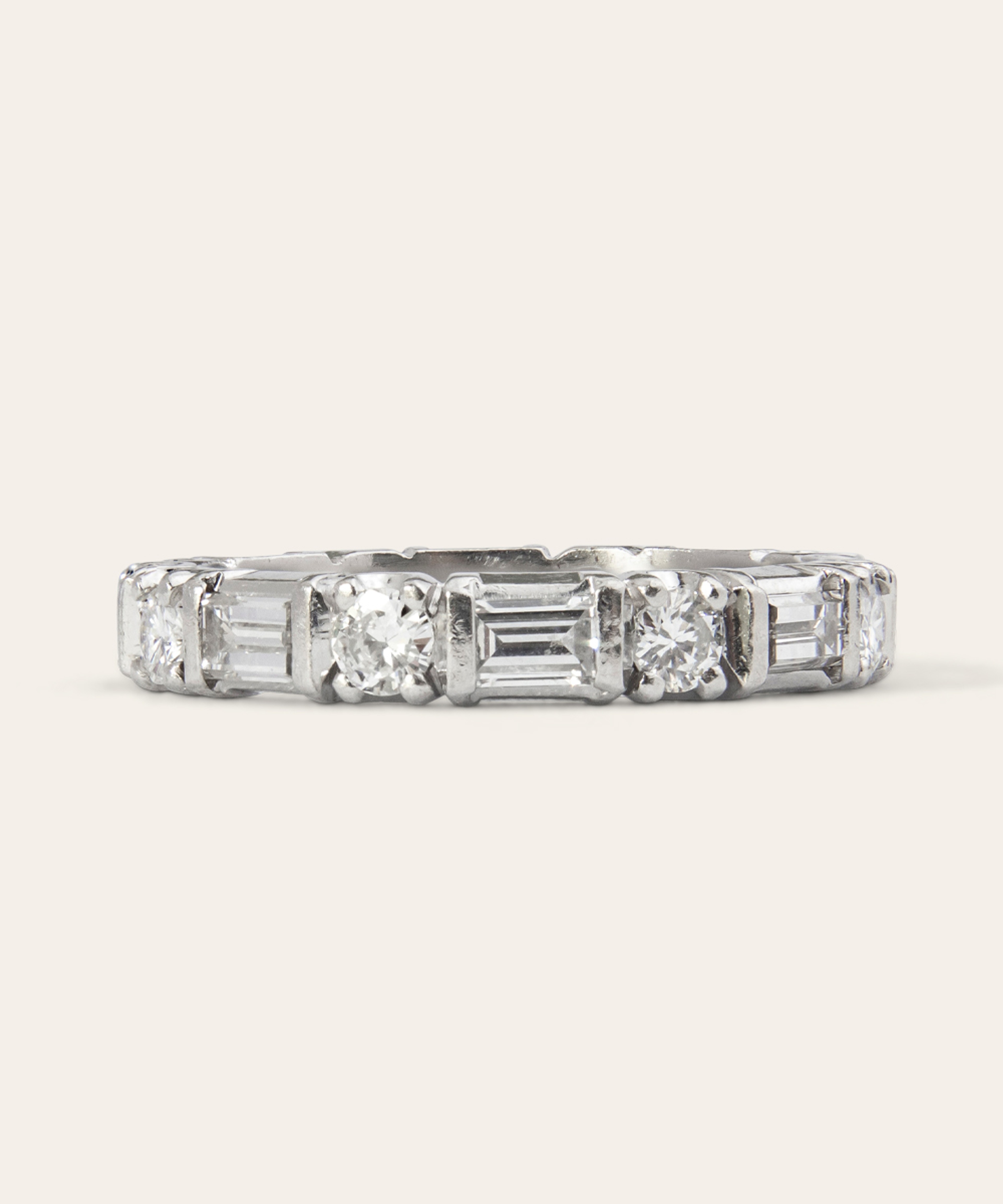 A vintage single-band diamond ring, handcrafted in platinum, set with round brilliant and baguette-cut diamonds with a total estimated diamond weight of 1.60 carats.