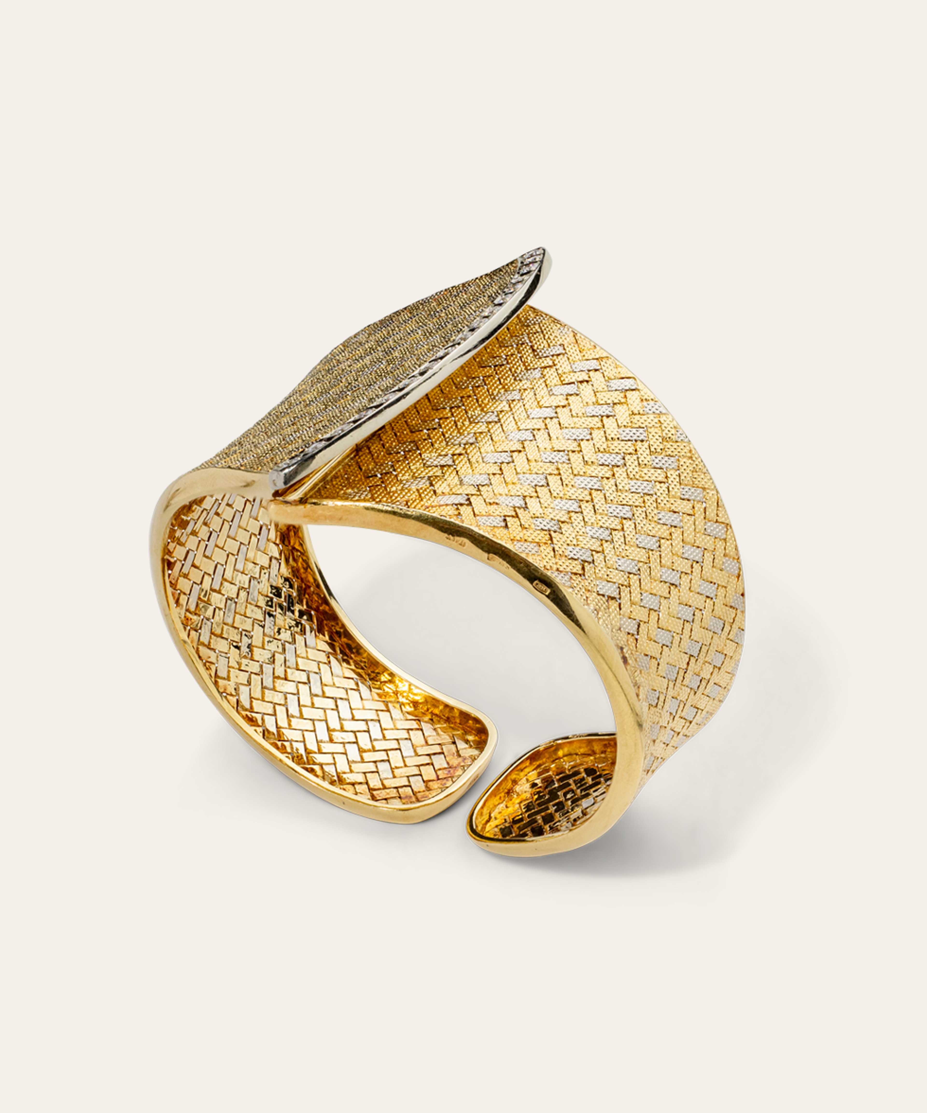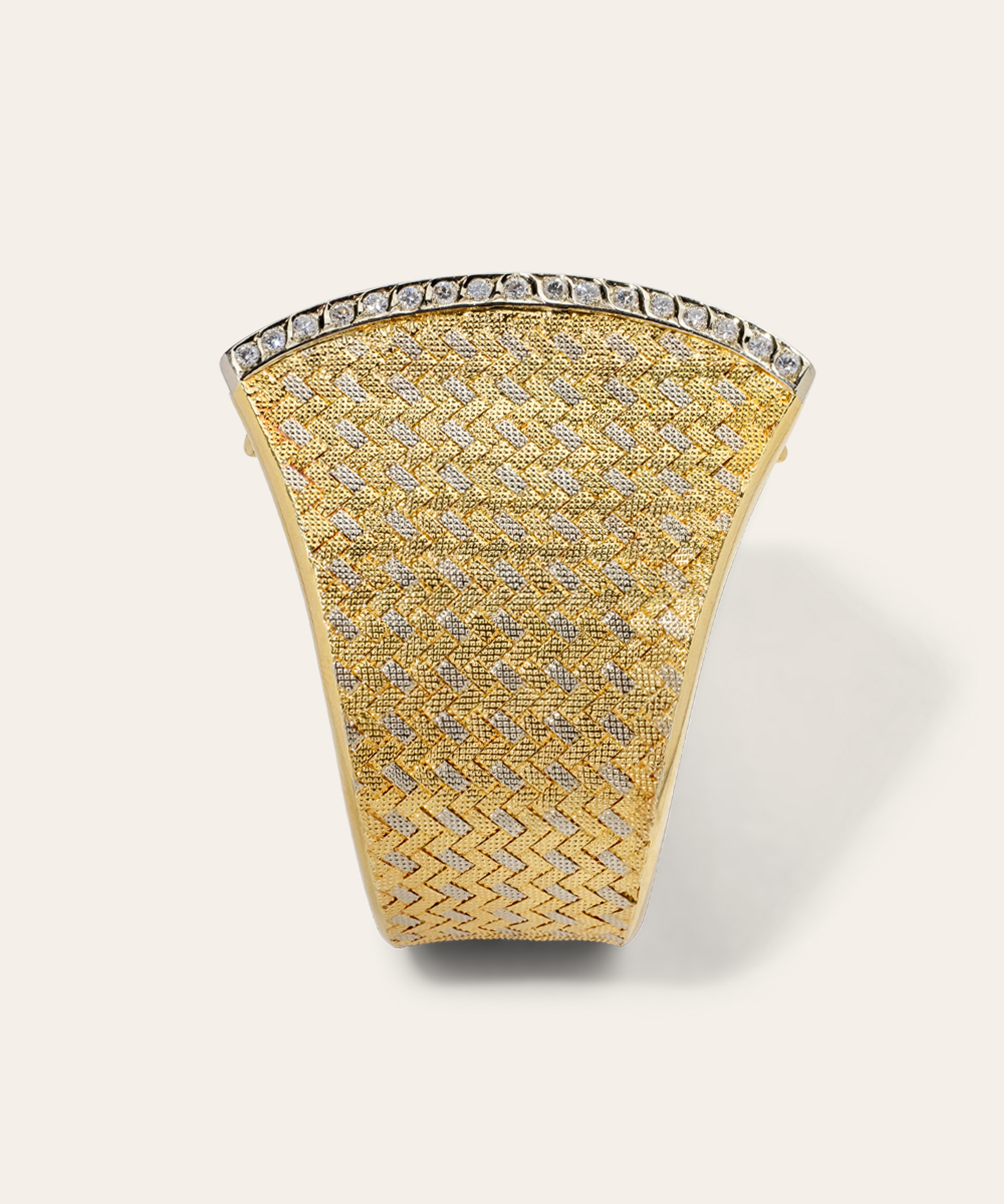 A vintage hinged cuff bracelet, handcrafted in Torino, Italy, circa 1960, from 18ct yellow and white gold. The piece is set with seventeen round brilliant cut diamonds totalling 1.00ct of H–J colour and VS1–VS2 clarity.