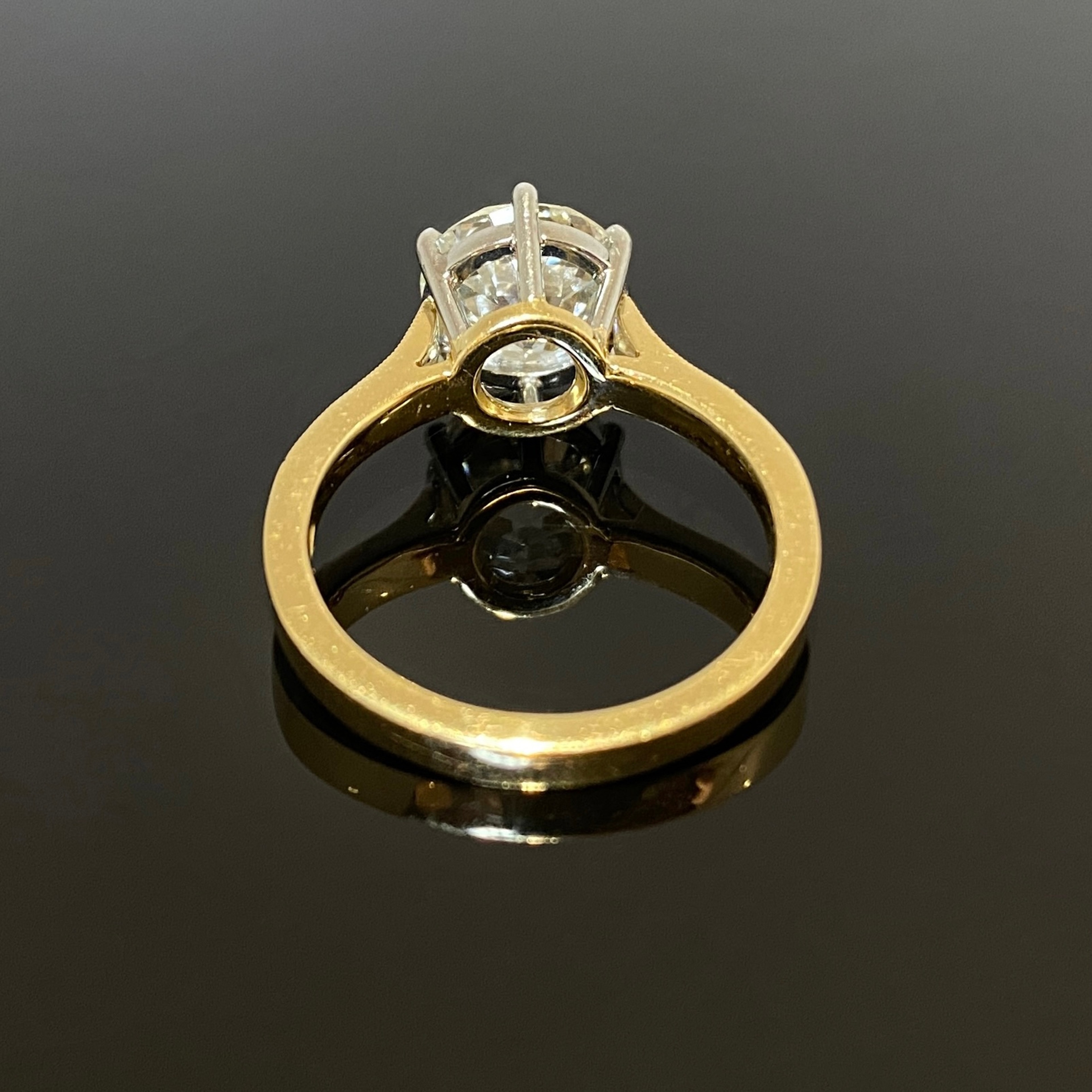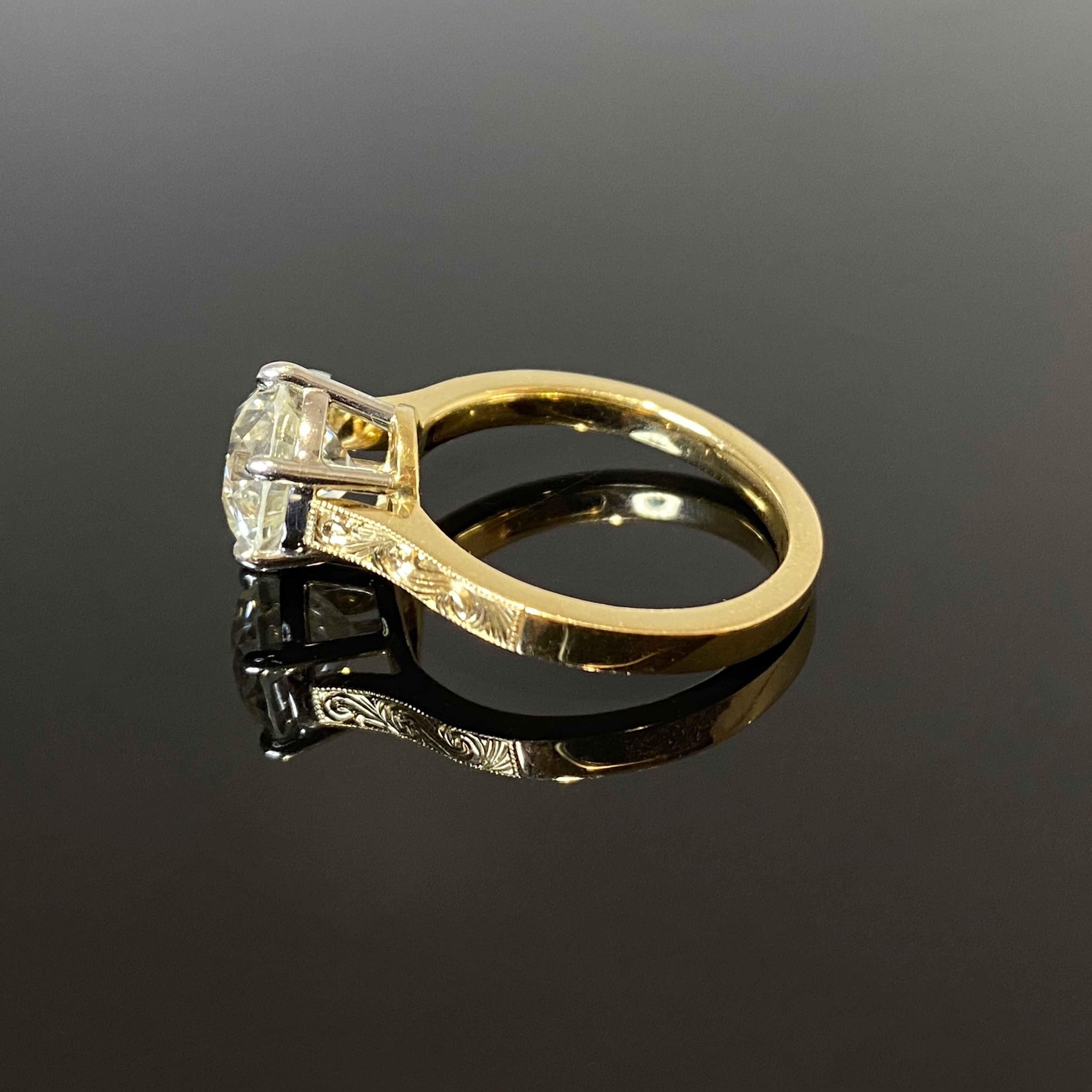 An antique 18ct yellow gold and platinum 6 claw set diamond solitaire ring. Featuring a 3.27ct old European brilliant cut, K colour, SI1 clarity central diamond set in a intricate filigree engraved band.